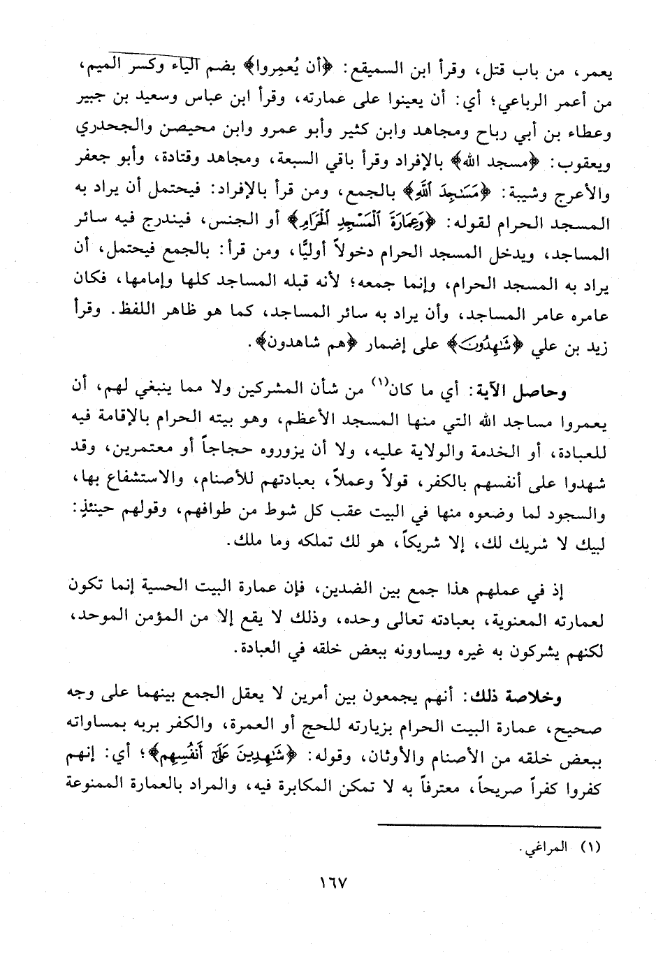 وخلاصة ذلك: أنهم يجمعون بين أمرين لا يعقل الجمع بينهما على وجه صحيح، عمارة البيت الحرام بزيارته للحج أو العمرة، والكفر بربه بمساواته ببعض خلقه من الأصنام والأوثان، وقوله: {شَاهِدِينَ عَلَى أَنْفُسِهِمْ}؛ أي: إنهم كفروا كفرًا صريحًا، معترفًا به لا تمكن المكابرة فيه، والمراد بالعمارة الممنوعة