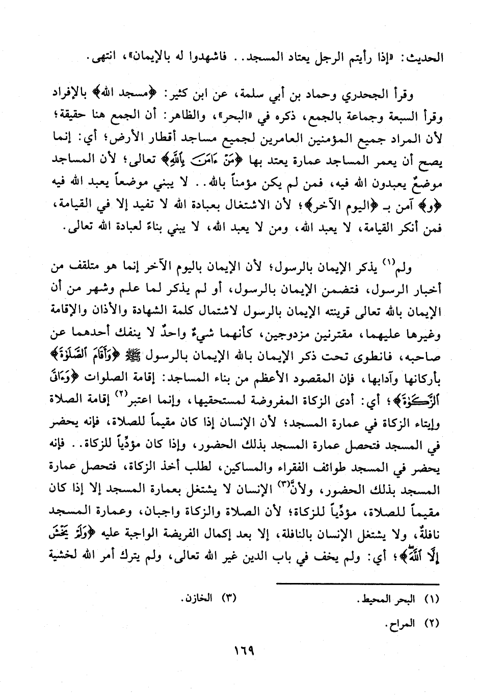 ولم (¬1) يذكر الإيمان بالرسول؛ لأن الإيمان باليوم الآخر إنما هو متلقف من أخبار الرسول، فتضمن الإيمان بالرسول، أو لم يذكر لما علم وشهر من أن الإيمان باللهِ تعالى قرينته الإيمان بالرسول لاشتمال كلمة الشهادة والأذان والإقامة وغيرها عليهما، مقترنين مزدوجين، كأنهما شيءٌ واحدٌ لا ينفك أحدهما عن صاحبه، فانطوى تحت ذكر الإيمان بالله الإيمان بالرسول - صلى الله عليه وسلم - {وَأَقَامَ الصَّلَاةَ} بأركانها وآدابها، فإن المقصود الأعظم من بناء المساجد: إقامة الصلوات {وَآتَى الزَّكَاةَ}؛ أي: أدى الزكاة المفروضة لمستحقيها، وإنما اعتبر (¬2) إقامة الصلاة وإيتاء الزكاة في عمارة المسجد؛ لأن الإنسان إذا كان مقيمًا للصلاة، فإنه يحضر في المسجد فتحصل عمارة المسجد بذلك الحضور، وإذا كان مؤدِّيًا للزكاة .. فإنه يحضر في المسجد طوائف الفقراء والمساكين، لطلب أخذ الزكاة، فتحصل عمارة المسجد بذلك الحضور، ولأنَّ (¬3) الإنسان لا يشتغل بعمارة المسجد إلا إذا كان مقيمًا للصلاة، مؤدِّيًا للزكاة؛ لأن الصلاة والزكاة واجبان، وعمارة المسجد نافلةٌ، ولا يشتغل الإنسان بالنافلة، إلا بعد إكمال الفريضة الواجبة عليه {وَلَمْ يَخْشَ إِلَّا اللَّهَ}؛ أي: ولم يخف في باب الدين غير الله تعالى، ولم يترك أمر الله لخشية
