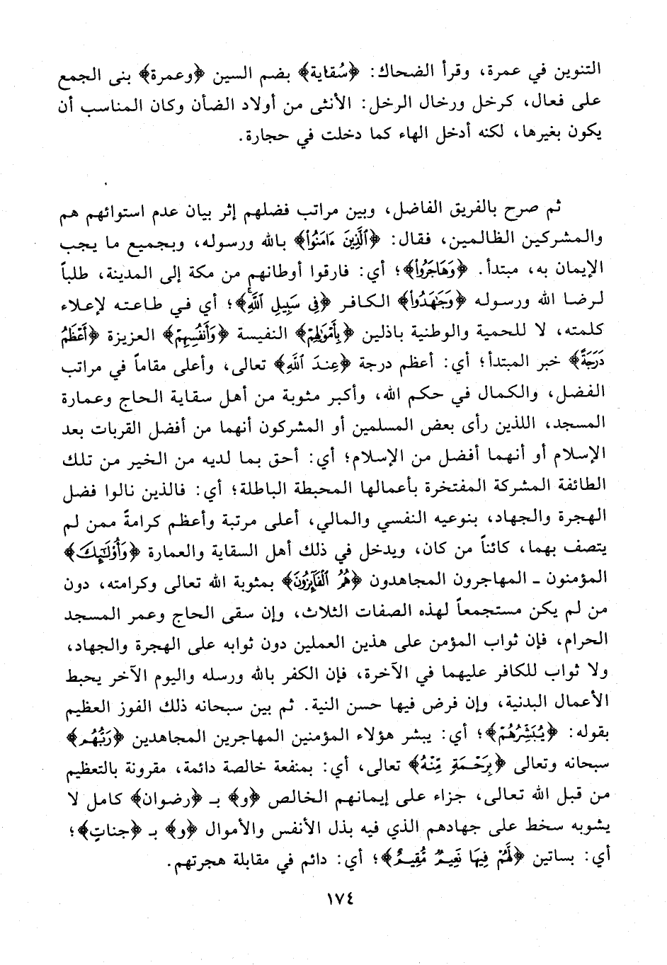 20 - ثم صرح بالفريق الفاضل، وبين مراتب فضلهم إثر بيان عدم استوائهم هم والمشركين الظالمين، فقال: {الَّذِينَ آمَنُوا} بالله ورسوله، وبجميع ما يجب الإيمان به، مبتدأ. {وَهَاجَرُوا}؛ أي: فارقوا أوطانهم من مكة إلى المدينة، طلبًا لرضا الله ورسوله {وَجَاهَدُوا} الكافر {فِي سَبِيلِ اللَّهِ}؛ أي في طاعته لإعلاء كلمته، لا للحمية والوطنية باذلين {بِأَمْوَالِهِمْ} النفيسة {وَأَنْفُسِهِمْ} العزيزة {أَعْظَمُ دَرَجَةً} خبر المبتدأ؛ أي: أعظم درجة {عِنْدَ اللَّهِ} تعالى، وأعلى مقامًا في مراتب الفضل، والكمال في حكم الله، وأكبر مثوبة من أهل سقاية الحاج وعمارة المسجد، اللذين رأى بعض المسلمين أو المشركون أنهما من أفضل القربات بعد الإِسلام أو أنهما أفضل من الإِسلام؛ أي: أحق بما لديه من الخير من تلك الطائفة المشركة المفتخرة بأعمالها المحبطة الباطلة؛ أي: فالذين نالوا فضل الهجرة والجهاد، بنوعيه النفسي والمالي، أعلى مرتبة وأعظم كرامةً ممن لم يتصف بهما، كائنًا من كان، ويدخل في ذلك أهل السقاية والعمارة {وَأُولَئِكَ} المؤمنون - المهاجرون المجاهدون {هُمُ الْفَائِزُونَ} بمثوبة الله تعالي وكرامته، دون من لم يكن مستجمعًا لهذه الصفات الثلاث، وإن سقى الحاج وعمر المسجد الحرام، فإن ثواب المؤمن على هذين العملين دون ثوابه على الهجرة والجهاد، ولا ثواب للكافر عليهما في الآخرة، فإن الكفر بالله ورسله واليوم الآخر يحبط الأعمال البدنية، وإن فرض فيها حسن النية.