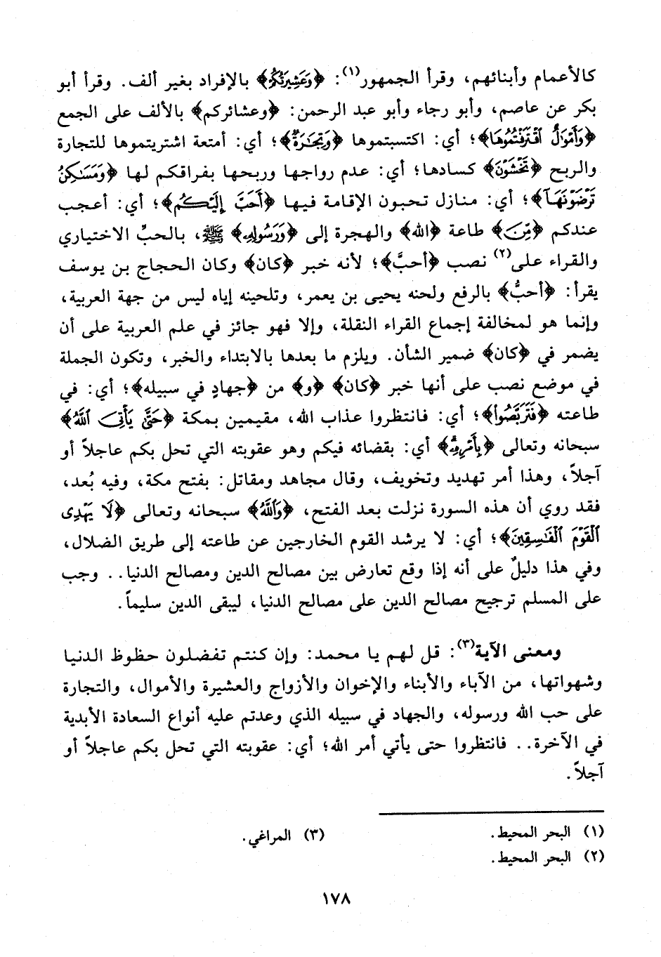 كالأعمام وأبنائهم، وقرأ الجمهور (¬1): {وَعَشِيرَتُكُمْ} بالإفراد بغير ألف. وقرأ أبو بكر عن عاصم، وأبو رجاء وأبو عبد الرحمن: {وعشائركم} بالألف على الجمع {وَأَمْوَالٌ اقْتَرَفْتُمُوهَا}؛ أي: اكتسبتموها {وَتِجَارَةٌ}؛ أي: أمتعة اشتريتموها للتجارة والربح {تَخْشَوْنَ} كسادها؛ أي: عدم رواجها وربحها بفراقكم لها {وَمَسَاكِنُ تَرْضَوْنَهَا}؛ أي: منازل تحبون الإقامة فيها {أَحَبَّ إِلَيْكُمْ}؛ أي: أعجب عندكم {مِنَ} طاعة {الله} والهجرة إلى {وَرَسُولِهِ} - صلى الله عليه وسلم -، بالحبِّ الاختياري والقراء على (¬2) نصب {أحبَّ}؛ لأنه خبر {كان} وكان الحجاج بن يوسف يقرأ: {أحبُّ} بالرفع ولحنه يحيى بن يعمر، وتلحينه إياه ليس من جهة العربية، وإنما هو لمخالفة إجماع القراء النقلة، وإلا فهو جائز في علم العربية على أن يضمر في {كان} ضمير الشأن. ويلزم ما بعدها بالابتداء والخبر، وتكون الجملة في موضع نصب على أنها خبر {كان} {و} من {جهادٍ في سبيله}؛ أي: في طاعته {فَتَرَبَّصُوا}؛ أي: فانتظروا عذاب الله، مقيمين بمكة {حَتَّى يَأْتِيَ اللَّهُ} سبحانه وتعالى {بِأَمْرِهِ} أي: بقضائه فيكم وهو عقوبته التي تحل بكم عاجلًا أو آجلًا، وهذا أمر تهديد وتخويف، وقال مجاهد ومقاتل: بفتح مكة، وفيه بُعد، فقد روي أن هذه السورة نزلت بعد الفتح، {وَاللَّهُ} سبحانه وتعالى {لَا يَهْدِي الْقَوْمَ الْفَاسِقِينَ}؛ أي: لا يرشد القوم الخارجين عن طاعته إلى طريق الضلال، وفي هذا دليلٌ على أنه إذا وقع تعارض بين مصالح الدين ومصالح الدنيا .. وجب على المسلم ترجيح مصالح الدين على مصالح الدنيا، ليبقى الدين سليمًا.