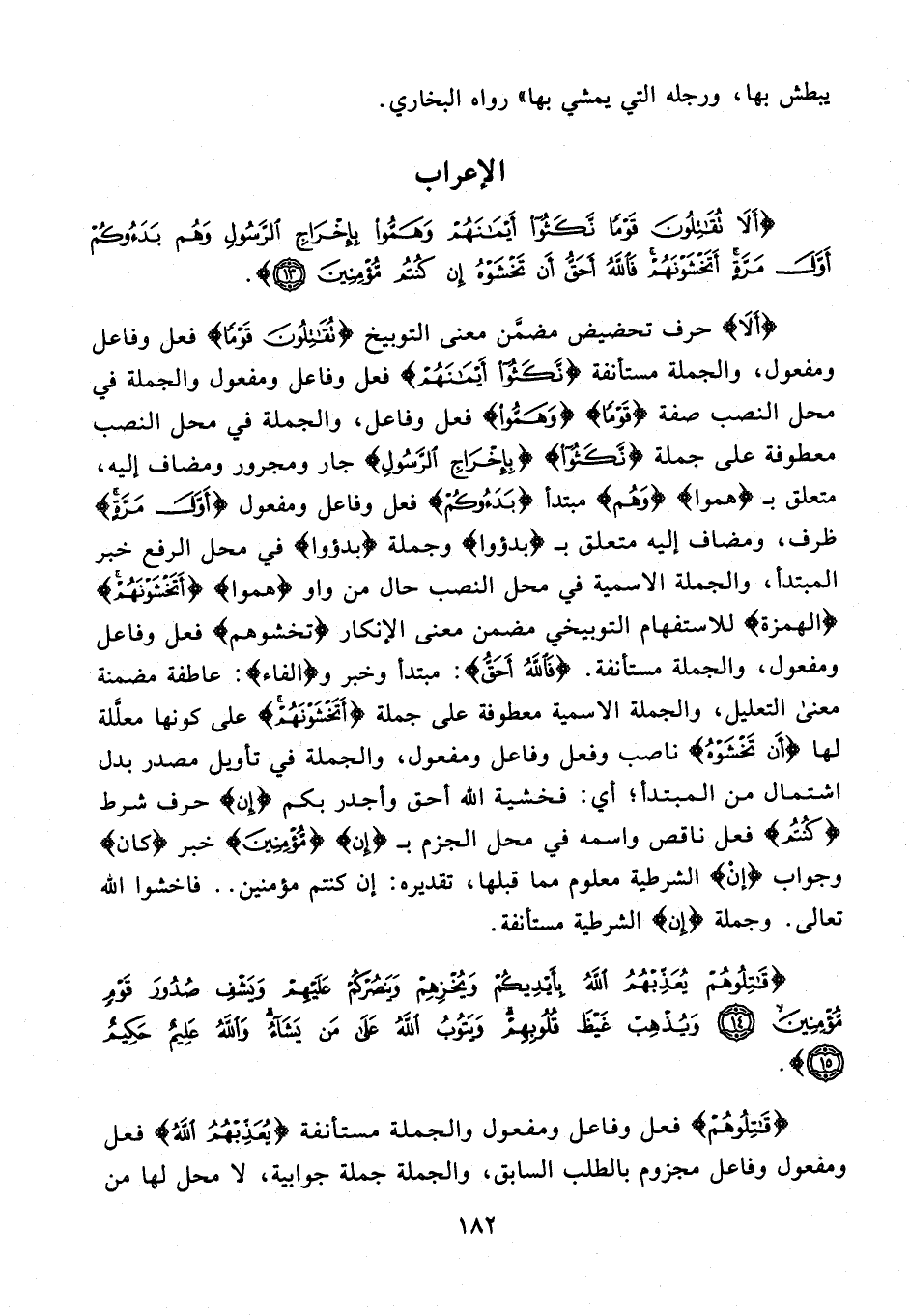 {أَلَا} حرف تحضيض مضمَّن معنى التوبيخ {تُقَاتِلُونَ قَوْمًا} فعل وفاعل ومفعول، والجملة مستأنفة {نَكَثُوا أَيْمَانَهُمْ} فعل وفاعل ومفعول والجملة في محل النصب صفة {قَوْمًا} {وَهَمُّوا} فعل وفاعل، والجملة في محل النصب معطوفة على جملة {نَكَثُوا} {بِإِخْرَاجِ الرَّسُولِ} جار ومجرور ومضاف إليه، متعلق بـ {هموا} {وَهُمْ} مبتدأ {بَدَءُوكُمْ} فعل وفاعل ومفعول {أَوَّلَ مَرَّةٍ} ظرف، ومضاف إليه متعلق بـ {بدؤوا} وجملة {بدؤوا} في محل الرفع خبر المبتدأ، والجملة الاسمية في محل النصب حال من واو {هموا} {أَتَخْشَوْنَهُمْ} {الهمزة} للاستفهام التوبيخي مضمن معنى الإنكار {تخشوهم} فعل وفاعل ومفعول، والجملة مستأنفة. {فَاللَّهُ أَحَقُّ}: مبتدأ وخبر و {الفاء}: عاطفة مضمنة معنى التعليل، والجملة الاسمية معطوفة على جملة {أَتَخْشَوْنَهُمْ} على كونها معلَّلة لها {أَنْ تَخْشَوْهُ} ناصب وفعل وفاعل ومفعول، والجملة في تأويل مصدر بدل اشتمال من المبتدأ؛ أي: فخشية الله أحق وأجدر بكم {إن} حرف شرط {كُنْتُمْ} فعل ناقص واسمه في محل الجزم بـ {إِن} {مُؤْمِنِينَ} خبر {كان} وجواب {إنْ} الشرطية معلوم مما قبلها، تقديره: إن كنتم مؤمنين .. فاخشوا الله تعالى. وجملة {إِن} الشرطية مستأنفة.