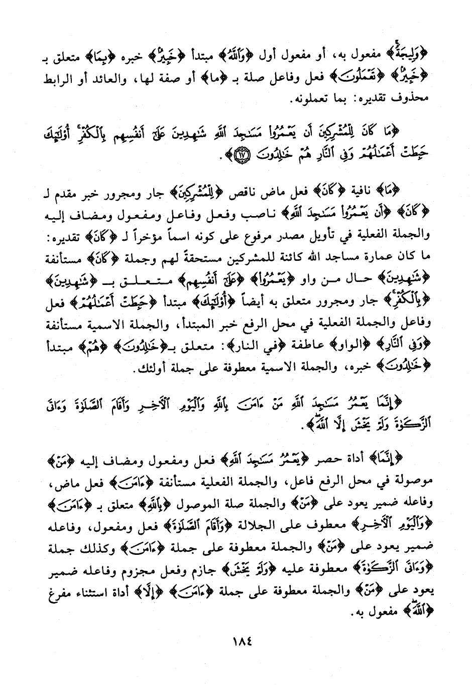 {إِنَّمَا} أداة حصر {يَعْمُرُ مَسَاجِدَ اللَّهِ} فعل ومفعول ومضاف إليه {مَنْ} موصولة في محل الرفع فاعل، والجملة الفعلية مستأنفة {آمَنَ} فعل ماض، وفاعله ضمير يعود على {مَنْ} والجملة صلة الموصول {بِاللَّهِ} متعلق بـ {آمَنَ} {وَالْيَوْمِ الْآخِرِ} معطوف على الجلالة {وَأَقَامَ الصَّلَاةَ} فعل ومفعول، وفاعله ضمير يعود على {مَنْ} والجملة معطوفة على جملة {آمَنَ} وكذلك جملة {وَآتَى الزَّكَاةَ} معطوفة عليه {وَلَمْ يَخْشَ} جازم وفعل مجزوم وفاعله ضمير يعود على {مَنْ} والجملة معطوفة على جملة {آمَنَ} {إِلَّا} أداة استثناء مفرغ {اللَّهَ} مفعول به.