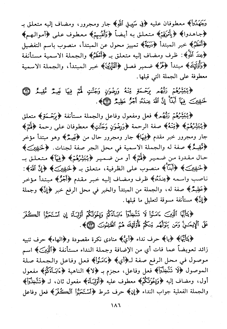 {يُبَشِّرُهُمْ رَبُّهُمْ} فعل ومفعول وفاعل والجملة مستأنفة {بِرَحْمَةٍ} متعلق {يُبَشِّرُهُمْ} {مِنْهُ} صفة الرحمة {وَرِضْوَانٍ وَجَنَّاتٍ} معطوفان على رحمة {لَهُمْ} جار ومجرور خبر مقدم {فِيهَا} جار ومجرور حال من {نَعِيمٌ} وهو مبتدأ مؤخر {مُقِيمٌ} صفة له والجملة الاسمية في محل الجر صفة لجنات. {خَالِدِينَ} حال مقدرة من ضمير {لَهُمْ} أو من ضمير {يُبَشِّرُهُمْ} {فِيهَاَ} متعلق بـ {خَالِدِينَ} {أَبَدًا} منصوب على الظرفية، متعلق بـ {خَالِدِينَ} {إِنَّ اللَّهَ}: ناصب واسمه {عِنْدَهُ} ظرف ومضاف إليه خبر مقدم {أَجْرٌ} مبتدأ مؤخر {عَظِيمٌ} صفة له، والجملة من المبتدأ والخبر في محل الرفع خبر {إنَّ} وجملة {إِنَّ} مستأنفة مسوقة لتعليل ما قبلها.