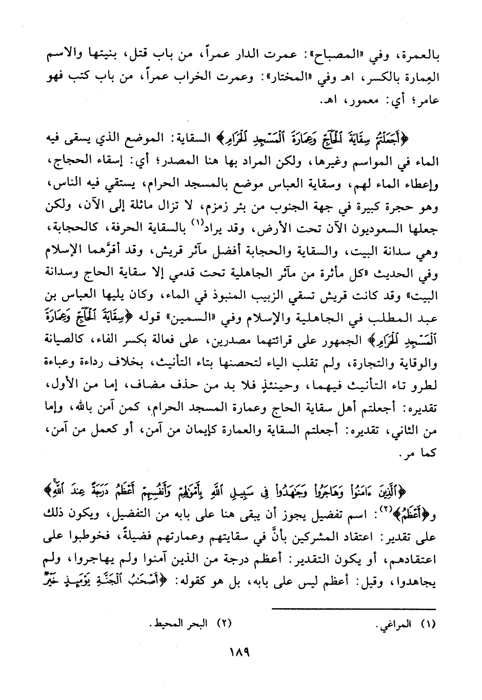 {أَجَعَلْتُمْ سِقَايَةَ الْحَاجِّ وَعِمَارَةَ الْمَسْجِدِ الْحَرَامِ} السقاية: الموضع الذي يسقى فيه الماء في المواسم وغيرها، ولكن المراد بها هنا المصدر؛ أي: إسقاء الحجاج، وإعطاء الماء لهم، وسقاية العباس موضع بالمسجد الحرام، يستقي فيه الناس، وهو حجرة كبيرة في جهة الجنوب من بئر زمزم، لا تزال ماثلة إلى الآن، ولكن جعلها السعوديون الآن تحت الأرض، وقد يراد (¬1) بالسقاية الحرفة، كالحجابة، وهي سدانة البيت، والسقاية والحجابة أفضل مآثر قريش، وقد أقرَّهما الإسلام وفي الحديث "كل مأثرة من مآثر الجاهلية تحت قدمي إلا سقاية الحاج وسدانة البيت" وقد كانت قريش تسقي الزبيب المنبوذ في الماء، وكان يليها العباس بن عبد المطلب في الجاهلية والإسلام وفي "السمين" قوله {سِقَايَةَ الْحَاجِّ وَعِمَارَةَ الْمَسْجِدِ} الجمهور على قرائتهما مصدرين، على فعالة بكسر الفاء، كالصيانة والوقاية والتجارة، ولم تقلب الياء لتحصنها بتاء التأنيث، بخلاف رداءة وعباءة لطرو تاء التأنيث فيهما، وحينئذٍ فلا بد من حذف مضاف، إما من الأول، تقديره: أجعلتم أهل سقاية الحاج وعمارة المسجد الحرام، كمن آمن بالله، وإما من الثاني، تقديره: أجعلتم السقاية والعمارة كإيمان من آمن، أو كعمل من آمن، كما مر.