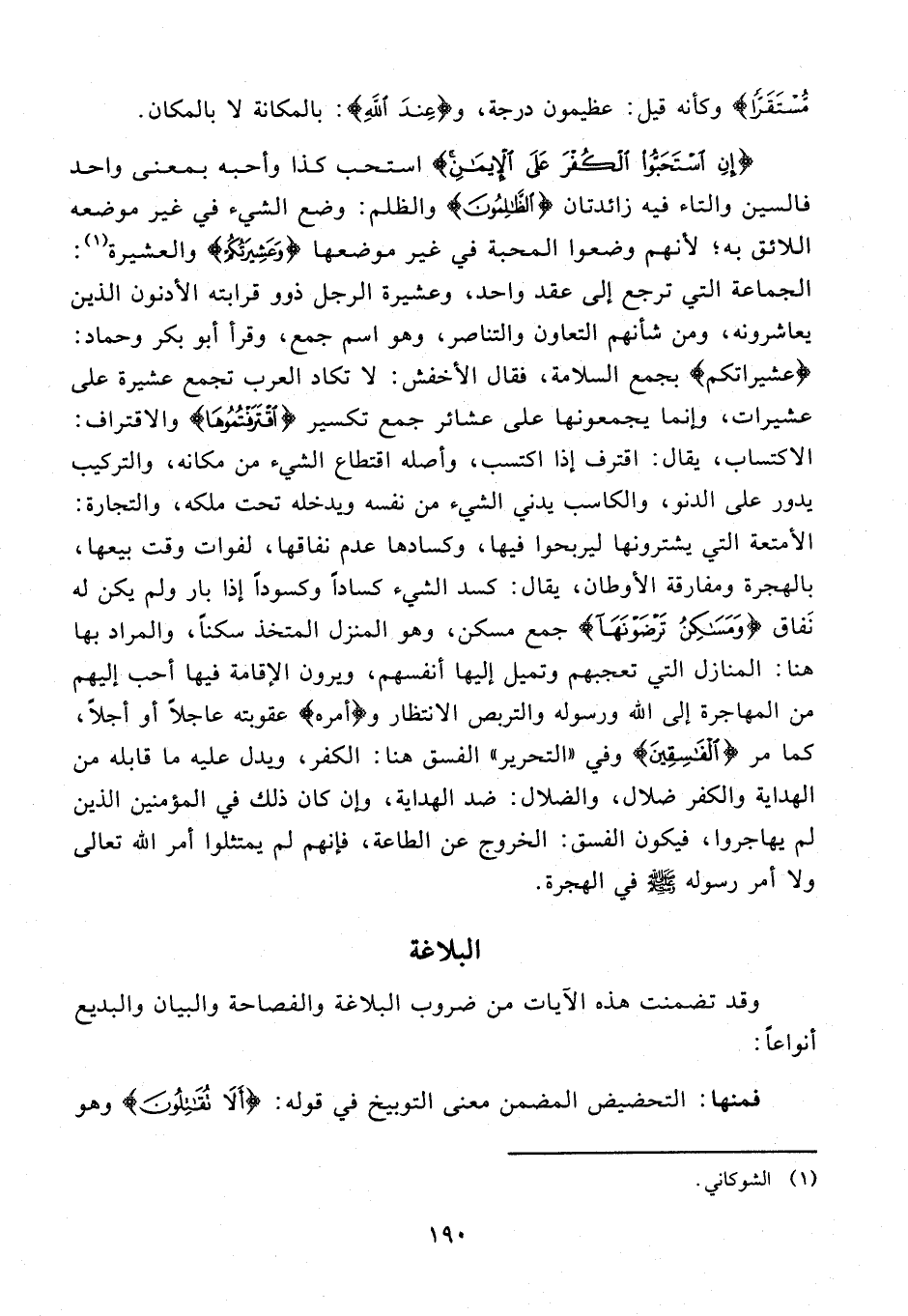 {إِنِ اسْتَحَبُّوا الْكُفْرَ عَلَى الْإِيمَانِ} استحب كذا وأحبه بمعنى واحد فالسين والتاء فيه زائدتان {الظَّالِمُونَ} والظلم: وضع الشيء في غير موضعه اللائق به؛ لأنهم وضعوا المحبة في غير موضعها {وَعَشِيرَتُكُمْ} والعشيرة (¬1): الجماعة التي ترجع إلى عقد واحد، وعشيرة الرجل ذوو قرابته الأدنون الذين يعاشرونه، ومن شأنهم التعاون والتناصر، وهو اسم جمع، وقرأ أبو بكر وحماد: {عشيراتكم} بجمع السلامة، فقال الأخفش: لا تكاد العرب تجمع عشيرة على عشيرات، وإنما يجمعونها على عشائر جمع تكسير {اقْتَرَفْتُمُوهَا} والاقتراف: الاكتساب، يقال: اقترف إذا اكتسب، وأصله اقتطاع الشيء من مكانه، والتركيب يدور على الدنو، والكاسب يدني الشيء من نفسه ويدخله تحت ملكه، والتجارة: الأمتعة التي يشترونها ليربحوا فيها، وكسادها عدم نفاقها، لفوات وقت بيعها، بالهجرة ومفارقة الأوطان، يقال: كسد الشيء كسادًا وكسودًا إذا بار ولم يكن له نَفاق {وَمَسَاكِنُ تَرْضَوْنَهَا} جمع مسكن، وهو المنزل المتخذ سكنًا، والمراد بها هنا: المنازل التي تعجبهم وتميل إليها أنفسهم، ويرون الإقامة فيها أحب إليهم من المهاجرة إلى الله ورسوله والتربص الانتظار و {أَمْرِه} عقوبته عاجلًا أو أجلًا، كما مر {الْفَاسِقِينَ} وفي "التحرير" الفسق هنا: الكفر، ويدل عليه ما قابله من الهداية والكفر ضلال، والضلال: ضد الهداية، وإن كان ذلك في المؤمنين الذين لم يهاجروا، فيكون الفسق: الخروج عن الطاعة، فإنهم لم يمتثلوا أمر الله تعالى ولا أمر رسوله - صلى الله عليه وسلم - في الهجرة.