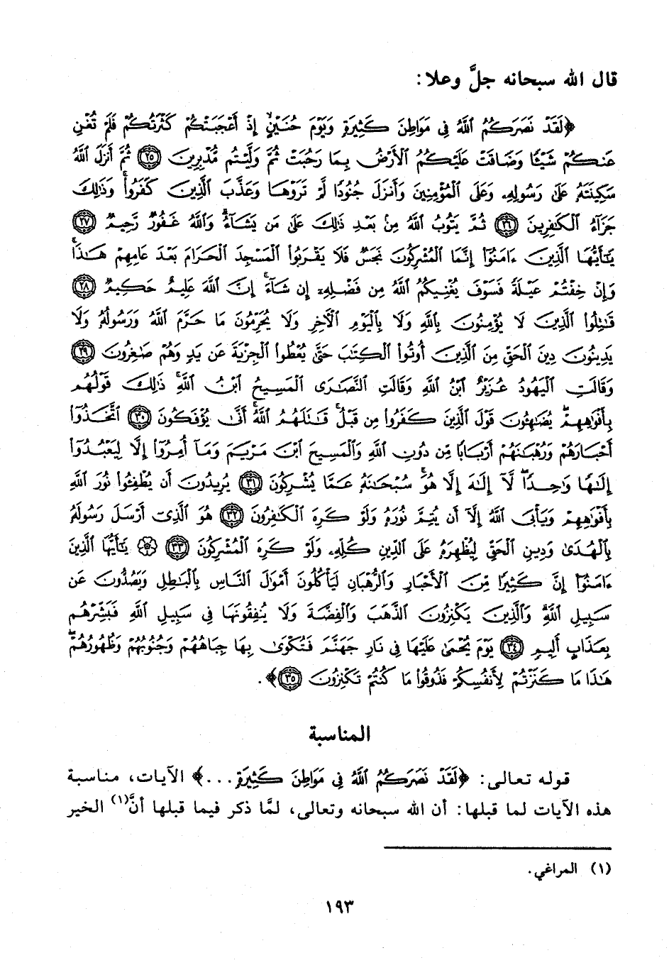 {لَقَدْ نَصَرَكُمُ اللَّهُ فِي مَوَاطِنَ كَثِيرَةٍ وَيَوْمَ حُنَيْنٍ إِذْ أَعْجَبَتْكُمْ كَثْرَتُكُمْ فَلَمْ تُغْنِ عَنْكُمْ شَيْئًا وَضَاقَتْ عَلَيْكُمُ الْأَرْضُ بِمَا رَحُبَتْ ثُمَّ وَلَّيْتُمْ مُدْبِرِينَ (25) ثُمَّ أَنْزَلَ اللَّهُ سَكِينَتَهُ عَلَى رَسُولِهِ وَعَلَى الْمُؤْمِنِينَ وَأَنْزَلَ جُنُودًا لَمْ تَرَوْهَا وَعَذَّبَ الَّذِينَ كَفَرُوا وَذَلِكَ جَزَاءُ الْكَافِرِينَ (26) ثُمَّ يَتُوبُ اللَّهُ مِنْ بَعْدِ ذَلِكَ عَلَى مَنْ يَشَاءُ وَاللَّهُ غَفُورٌ رَحِيمٌ (27) يَا أَيُّهَا الَّذِينَ آمَنُوا إِنَّمَا الْمُشْرِكُونَ نَجَسٌ فَلَا يَقْرَبُوا الْمَسْجِدَ الْحَرَامَ بَعْدَ عَامِهِمْ هَذَا وَإِنْ خِفْتُمْ عَيْلَةً فَسَوْفَ يُغْنِيكُمُ اللَّهُ مِنْ فَضْلِهِ إِنْ شَاءَ إِنَّ اللَّهَ عَلِيمٌ حَكِيمٌ (28) قَاتِلُوا الَّذِينَ لَا يُؤْمِنُونَ بِاللَّهِ وَلَا بِالْيَوْمِ الْآخِرِ وَلَا يُحَرِّمُونَ مَا حَرَّمَ اللَّهُ وَرَسُولُهُ وَلَا يَدِينُونَ دِينَ الْحَقِّ مِنَ الَّذِينَ أُوتُوا الْكِتَابَ حَتَّى يُعْطُوا الْجِزْيَةَ عَنْ يَدٍ وَهُمْ صَاغِرُونَ (29) وَقَالَتِ الْيَهُودُ عُزَيْرٌ ابْنُ اللَّهِ وَقَالَتِ النَّصَارَى الْمَسِيحُ ابْنُ اللَّهِ ذَلِكَ قَوْلُهُمْ بِأَفْوَاهِهِمْ يُضَاهِئُونَ قَوْلَ الَّذِينَ كَفَرُوا مِنْ قَبْلُ قَاتَلَهُمُ اللَّهُ أَنَّى يُؤْفَكُونَ (30) اتَّخَذُوا أَحْبَارَهُمْ وَرُهْبَانَهُمْ أَرْبَابًا مِنْ دُونِ اللَّهِ وَالْمَسِيحَ ابْنَ مَرْيَمَ وَمَا أُمِرُوا إِلَّا لِيَعْبُدُوا إِلَهًا وَاحِدًا لَا إِلَهَ إِلَّا هُوَ سُبْحَانَهُ عَمَّا يُشْرِكُونَ (31) يُرِيدُونَ أَنْ يُطْفِئُوا نُورَ اللَّهِ بِأَفْوَاهِهِمْ وَيَأْبَى اللَّهُ إِلَّا أَنْ يُتِمَّ نُورَهُ وَلَوْ كَرِهَ الْكَافِرُونَ (32) هُوَ الَّذِي أَرْسَلَ رَسُولَهُ بِالْهُدَى وَدِينِ الْحَقِّ لِيُظْهِرَهُ عَلَى الدِّينِ كُلِّهِ وَلَوْ كَرِهَ الْمُشْرِكُونَ (33) يَا أَيُّهَا الَّذِينَ آمَنُوا إِنَّ كَثِيرًا مِنَ الْأَحْبَارِ وَالرُّهْبَانِ لَيَأْكُلُونَ أَمْوَالَ النَّاسِ بِالْبَاطِلِ وَيَصُدُّونَ عَنْ سَبِيلِ اللَّهِ وَالَّذِينَ يَكْنِزُونَ الذَّهَبَ وَالْفِضَّةَ وَلَا يُنْفِقُونَهَا فِي سَبِيلِ اللَّهِ فَبَشِّرْهُمْ بِعَذَابٍ أَلِيمٍ (34) يَوْمَ يُحْمَى عَلَيْهَا فِي نَارِ جَهَنَّمَ فَتُكْوَى بِهَا جِبَاهُهُمْ وَجُنُوبُهُمْ وَظُهُورُهُمْ هَذَا مَا كَنَزْتُمْ لِأَنْفُسِكُمْ فَذُوقُوا مَا كُنْتُمْ تَكْنِزُونَ (35)}.