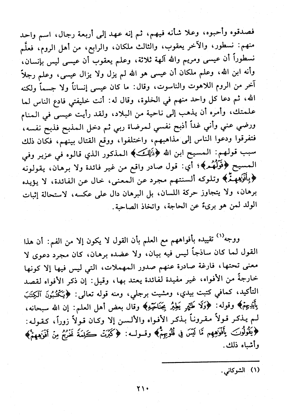 فصدقوه وأحبوه، وعلا شأنه فيهم، ثم إنه عهد إلى أربعة رجال، اسم واحد منهم: نسطور، والآخر يعقوب، والثالث ملكان، والرابع، من أهل الروم، فعلَّم نسطورًا أن عيسى ومريم والله آلهة ثلاثة، وعلم يعقوب أن عيسى ليس بإنسان، وأنه ابن الله، وعلم ملكان أن عيسى هو الله لم يزل ولا يزال عيسى، وعلم رجلًا آخر من الروم اللاهوت والناسوت، وقال: ما كان عيسى إنسانًا ولا جسمًا ولكنه الله، ثم دعا كل واحد منهم في الخلوة، وقال له: أنت خليفتي فادع الناس لما علمتك، وأمره أن يذهب إلى ناحية من البلاد، ولقد رأيت عيسى في المنام ورضي عني وأني غدًا أذبح نفسي لمرضاة ربي ثم دخل المذبح فذبح نفسه، فتفرقوا ودعوا الناس إلى مذاهبهم، واختلفوا، ووقع القتال بينهم، فكان ذلك سبب قولهم: المسيح ابن الله {ذَلِكَ} المذكور الذي قالوه في عزير وفي المسيح {قَوْلُهُمْ}؛ أي: قول صادر واقع من غير فائدة ولا برهان، يقولونه {بِأَفْوَاهِهِمْ} وتلوكه ألسنتهم مجرد عن المعنى، خال عن الفائدة، لا يؤيده برهان، ولا يتجاوز حركة اللسان، بل البرهان دال على عكسه، لاستحالة إثبات الولد لمن هو برىءٌ عن الحاجة، واتخاذ الصاحبة.