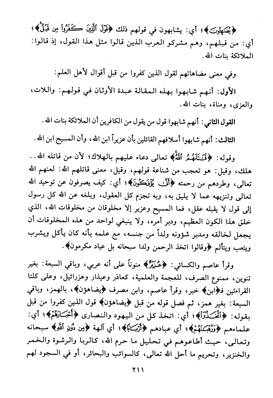 {يُضَاهِئُونَ}؛ أي: يشابهون في قولهم ذلك {قَوْلَ الَّذِينَ كَفَرُوا مِنْ قَبْلُ}؛ أي: من قبلهم، وهم مشركو العرب الذين قالوا مثل هذا القول، إذ قالوا: الملائكة بنات الله.
