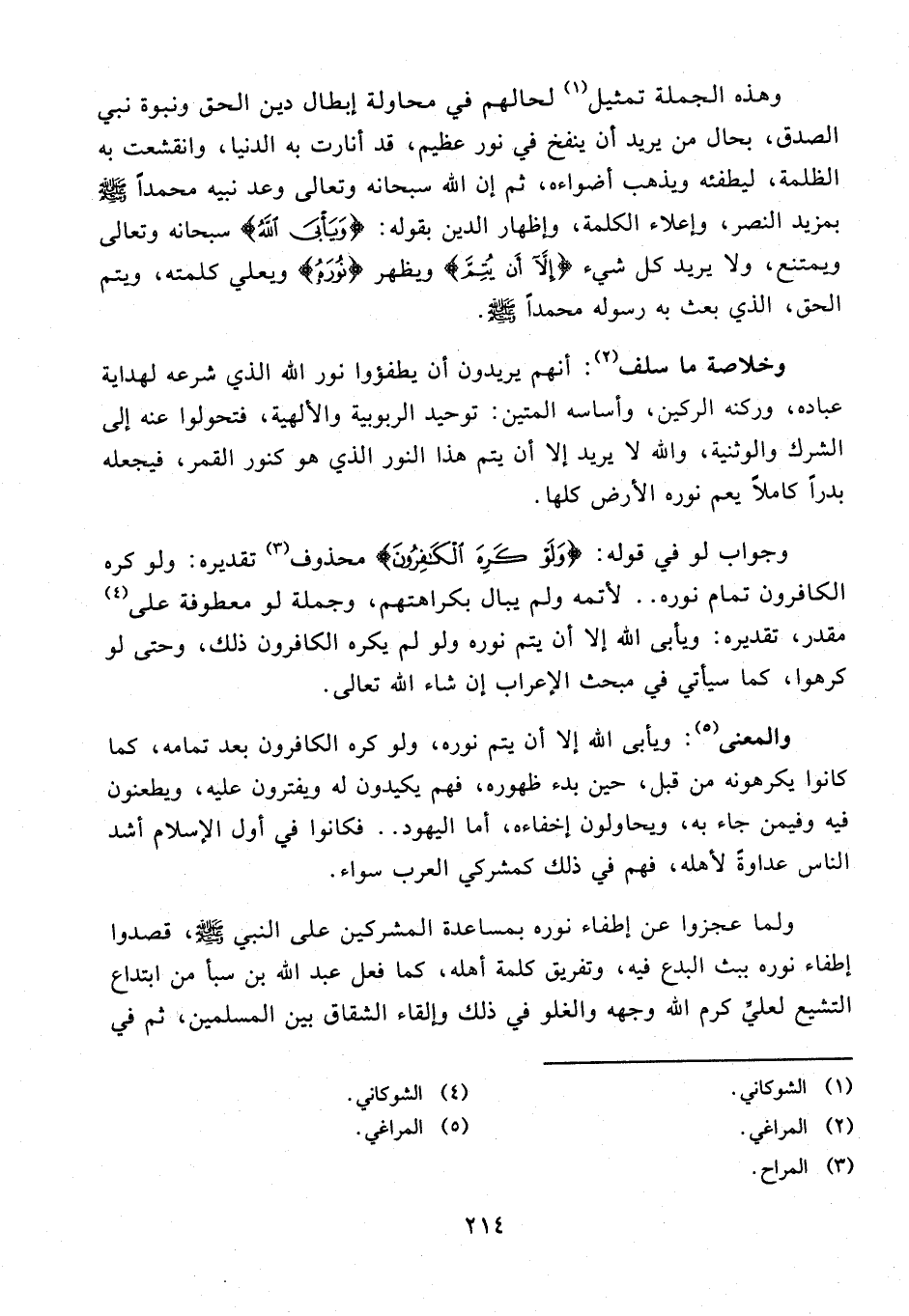 وخلاصة ما سلف (¬2): أنهم يريدون أن يطفؤوا نور الله الذي شرعه لهداية عباده، وركنه الركين، وأساسه المتين: توحيد الربوبية والألهية، فتحولوا عنه إلى الشرك والوثنية، والله لا يريد إلا أن يتم هذا النور الذي هو كنور القمر، فيجعله بدرًا كاملًا يعم نوره الأرض كلها.