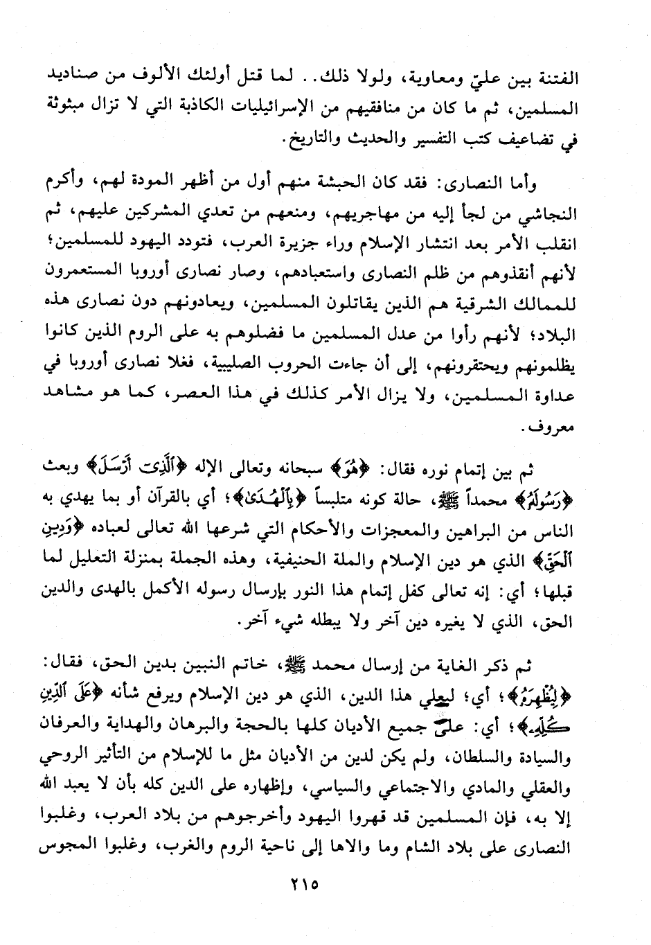 وأما النصارى: فقد كان الحبشة منهم أول من أظهر المودة لهم، وأكرم النجاشي من لجأ إليه من مهاجريهم، ومنعهم من تعدي المشركين عليهم، ثم انقلب الأمر بعد انتشار الإسلام وراء جزيرة العرب، فتودد اليهود للمسلمين؛ لأنهم أنقذوهم من ظلم النصارى واستعبادهم، وصار نصارى أوروبا المستعمرون للممالك الشرقية هم الذين يقاتلون المسلمين، ويعادونهم دون نصارى هذه البلاد؛ لأنهم رأوا من عدل المسلمين ما فضلوهم به على الروم الذين كانوا يظلمونهم ويحتقرونهم، إلى أن جاءت الحروب الصليبية، فغلا نصارى أوروبا في عداوة المسلمين، ولا يزال الأمر كذلك في هذا العصر، كما هو مشاهد معروف.