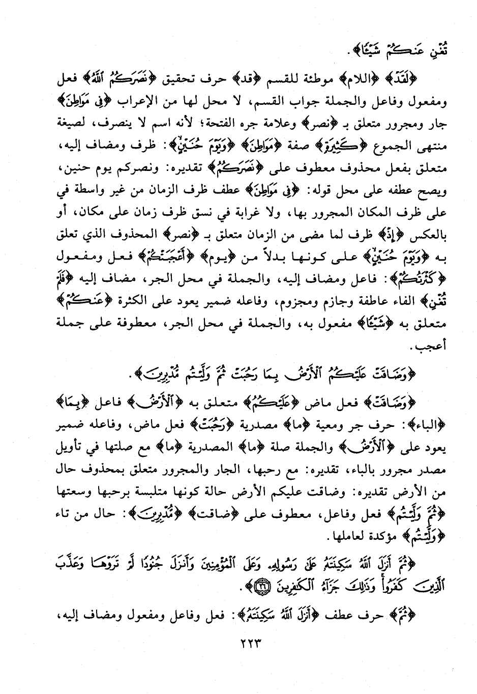 {لَقَدْ} {اللام} موطئة للقسم {قد} حرف تحقيق {نَصَرَكُمُ اللَّهُ} فعل ومفعول وفاعل والجملة جواب القسم، لا محل لها من الإعراب {فِي مَوَاطِنَ} جار ومجرور متعلق بـ {نصر} وعلامة جره الفتحة؛ لأنه اسم لا ينصرف، لصيغة منتهى الجموع {كَثِيرَةٍ} صفة {مَوَاطِنَ} {وَيَوْمَ حُنَيْنٍ}: ظرف ومضاف إليه، متعلق بفعل محذوف معطوف على {نَصَرَكُمُ} تقديره: ونصركم يوم حنين، ويصح عطفه على محل قوله: {فِي مَوَاطِنَ} عطف ظرف الزمان من غير واسطة في على ظرف المكان المجرور بها، ولا غرابة في نسق ظرف زمان على مكان، أو بالعكس {إِذْ} ظرف لما مضى من الزمان متعلق بـ {نصر} المحذوف الذي تعلق به {وَيَوْمَ حُنَيْنٍ} على كونها بدلًا من {يوم} {أَعْجَبَتْكُمْ} فعل ومفعول {كَثْرَتُكُمْ}: فاعل ومضاف إليه، والجملة في محل الجر، مضاف إليه {فَلَمْ تُغْنِ} الفاء عاطفة وجازم ومجزوم، وفاعله ضمير يعود على الكثرة {عَنْكُمْ} متعلق به {شَيْئًا} مفعول به، والجملة في محل الجر، معطوفة على جملة أعجب.