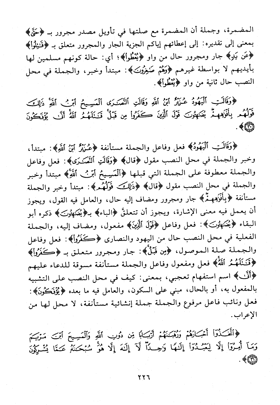 {وَقَالَتِ الْيَهُود} فعل وفاعل والجملة مستأنفة {عُزَيْرٌ ابْنُ اللَّهِ}: مبتدأ، وخبر والجملة في محل النصب مقول {قال} {وَقَالَتِ النَّصَارَى}: فعل وفاعل والجملة معطوفة على الجملة التي قبلها {الْمَسِيحُ ابْنُ اللَّهِ} مبتدأ وخبر والجملة في محل النصب مقول {قال} {ذَلِكَ قَوْلُهُمْ}: مبتدأ وخبر والجملة مستأنفة {بِأَفْوَاهِهِمْ} جار ومجرور ومضاف إليه حال، والعامل فيه القول، ويجوز أن يعمل فيه معنى الإشارة، ويجوز أن تتعلَّق {الباء} بـ {يُضَاهِئُونَ} ذكره أبو البقاء {يُضَاهِئُونَ}: فعل وفاعل {قَوْلَ الَّذِينَ} مفعول، ومضاف إليه، والجملة الفعلية في محل النصب حال من اليهود والنصارى {كَفَرُوا}: فعل وفاعل والجملة صلة الموصول، {مِنْ قَبْلُ}: جار ومجرور متعلق بـ {كَفَرُوا} {قَاتَلَهُمُ اللَّهُ} فعل ومفعول وفاعل والجملة مستأنفة مسوقة للدعاء عليهم {أَنَّى} اسم استفهام تعجبي، بمعنى: كيف في محل النصب على التشبيه بالمفعول به، أو بالحال، مبني على السكون، والعامل فيه ما بعده {يُؤْفَكُونَ}: فعل ونائب فاعل مرفوع والجملة جملة إنشائية مستأنفة، لا محل لها من الإعراب.