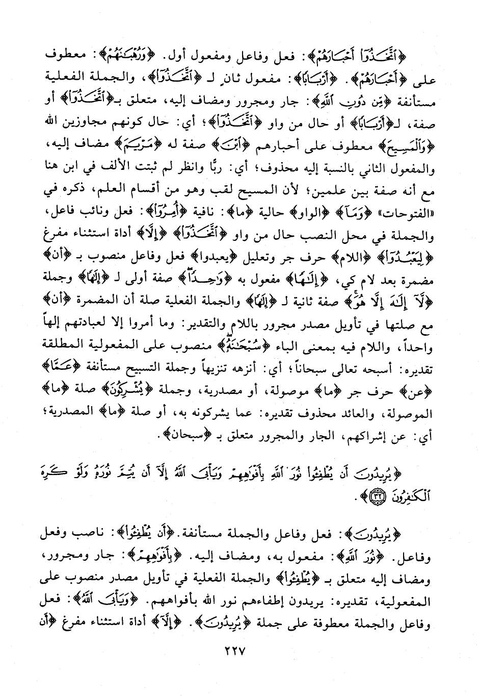 {اتَّخَذُوا أَحْبَارَهُمْ}: فعل وفاعل ومفعول أول. {وَرُهْبَانَهُمْ}: معطوف على {أَحْبَارَهُمْ}. {أَرْبَابًا}: مفعول ثانٍ لـ {اتَّخَذُوا}، والجملة الفعلية مستأنفة {مِنْ دُونِ اللَّهِ}: جار ومجرور ومضاف إليه، متعلق بـ {اتَّخَذُوا} أو صفة، لـ {أَرْبَابًا} أو حال من واو {اتَّخَذُوا}؛ أي: حال كونهم مجاوزين الله {وَالْمَسِيحَ} معطوف على أحبارهم {ابْنَ} صفة له {مَرْيَمَ} مضاف إليه، والمفعول الثاني بالنسبة إليه محذوف؛ أي: ربًّا وانظر لم ثبتت الألف في ابن هنا مع أنه صفة بين علمين؛ لأن المسيح لقب وهو من أقسام العلم، ذكره في "الفتوحات" {وَمَا} {الواو} حالية {ما}: نافية {أُمِرُوا}: فعل ونائب فاعل، والجملة في محل النصب حال من واو {اتَّخَذُوا} {إِلَّا} أداة استثناء مفرغ {لِيَعْبُدُوا} {اللام} حرف جر وتعليل {يعبدوا} فعل وفاعل منصوب بـ {أن} مضمرة بعد لام كي، {إِلَهًا} مفعول به {وَاحِدًا} صفة أولى لـ {إِلَهًا} وجملة {لَا إِلَهَ إِلَّا هُوَ} صفة ثانية لـ {إِلَهًا} والجملة الفعلية صلة أن المضمرة {أن} مع صلتها في تأويل مصدر مجرور باللام والتقدير: وما أمروا إلا لعبادتهم إلهًا واحدًا، واللام فيه بمعنى الباء {سُبْحَانَهُ} منصوب على المفعولية المطلقة تقديره: أسبحه تعالى سبحانًا؛ أي: أنزهه تنزيهًا وجملة التسبيح مستأنفة {عَمَّا} {عن} حرف جر {ما} موصولة، أو مصدرية، وجملة {يُشْرِكُونَ} صلة {ما} الموصولة، والعائد محذوف تقديره: عما يشركونه به، أو صلة {ما} المصدرية؛ أي: عن إشراكهم، الجار والمجرور متعلق بـ {سبحان}.
