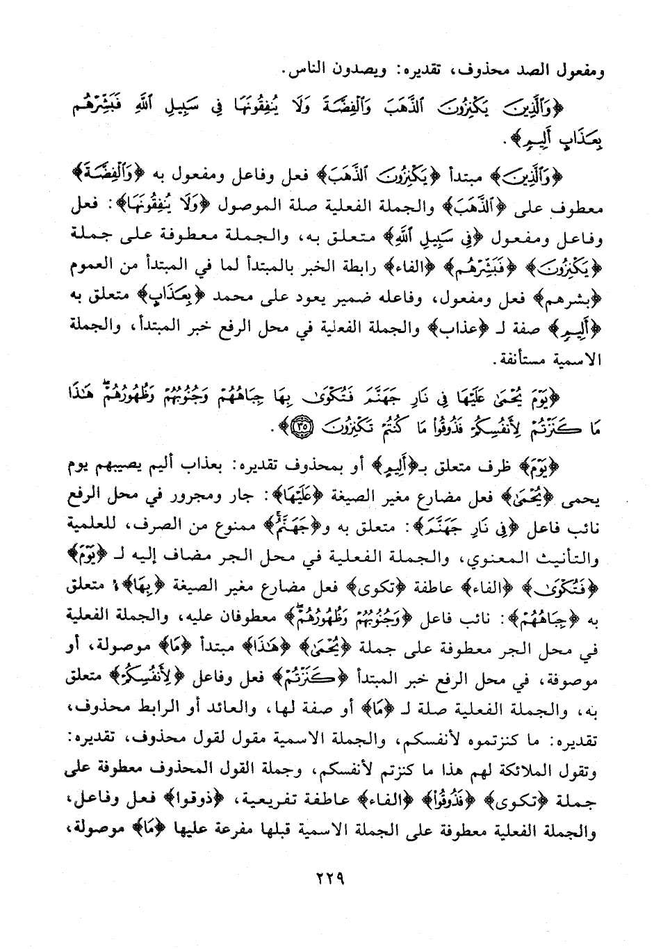 {وَالَّذِينَ} مبتدأ {يَكْنِزُونَ الذَّهَبَ} فعل وفاعل ومفعول به {وَالْفِضَّةَ} معطوف على {الذَّهَبَ} والجملة الفعلية صلة الموصول {وَلَا يُنْفِقُونَهَا}: فعل وفاعل ومفعول {فِي سَبِيلِ اللَّهِ} متعلق به، والجملة معطوفة على جملة {يَكْنِزُونَ} {فَبَشِّرْهُمْ} {الفاء} رابطة الخبر بالمبتدأ لما في المبتدأ من العموم {بشرهم} فعل ومفعول، وفاعله ضمير يعود على محمد {بِعَذَابٍ} متعلق به {أَلِيمٍ} صفة لـ {عذاب} والجملة الفعلية في محل الرفع خبر المبتدأ، والجملة الاسمية مستأنفة.