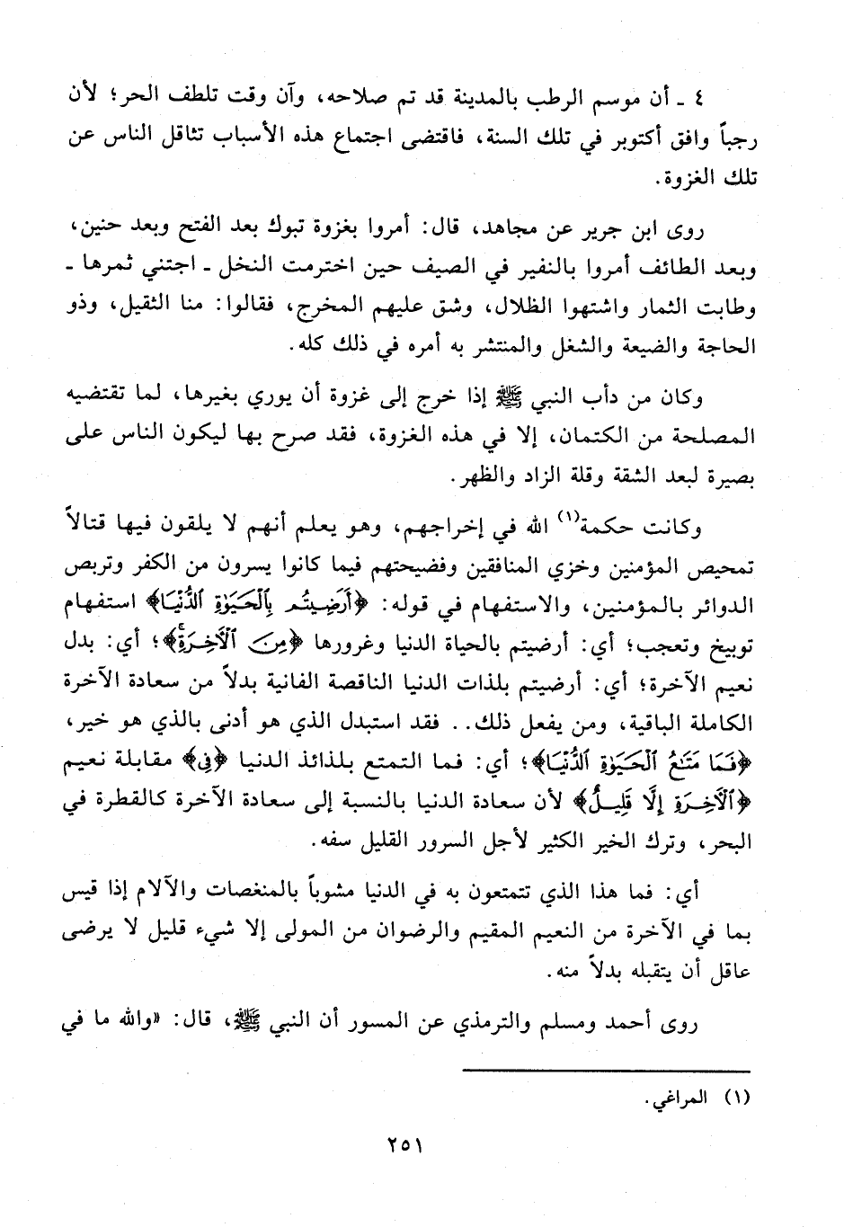 4 - أن موسم الرطب بالمدينة قد تم صلاحه، وآن وقت تلطف الحر؛ لأن رجبًا وافق أكتوبر في تلك السنة، فاقتضى اجتماع هذه الأسباب تثاقل الناس عن تلك الغزوة.