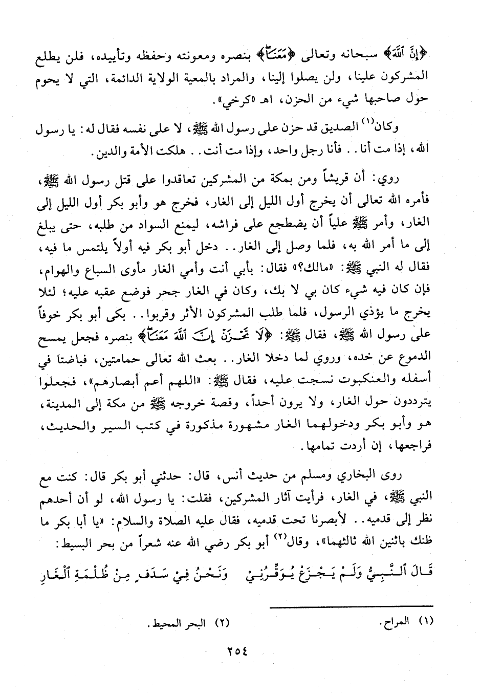 روى البخاري ومسلم من حديث أنس، قال: حدثني أبو بكر قال: كنت مع النبي - صلى الله عليه وسلم -، في الغار، فرأيت آثار المشركين، فقلت: يا رسول الله، لو أن أحدهم نظر إلى قدميه .. لأبصرنا تحت قدميه، فقال عليه الصلاة والسلام: "يا أبا بكر ما ظنك باثنين الله ثالثهما"، وقال (¬2) أبو بكر رضي الله عنه شعرًا من بحر البسيط: