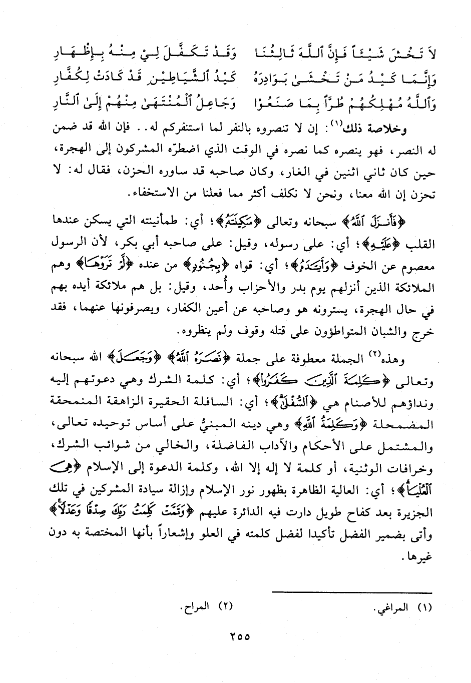 وهذه (¬2) الجملة معطوفة على جملة {نَصَرَهُ اَللهُ} {وَجَعَلَ} الله سبحانه وتعالى {كَلِمَةَ اَلَّذِينَ كَفَرُواْ}؛ أي: كلمة الشرك وهي دعوتهم إليه ونداؤهم للأصنام هي {السَّفْلى}؛ أي: السافلة الحقيرة الزاهقة المنمحقة المضمحلة {وَكَلِمَةُ اَللهِ} وهي دينه المبنيُّ على أساس توحيده تعالى، والمشتمل على الأحكام والآداب الفاضلة، والخالي من شوائب الشرك، وخرافات الوثنية، أو كلمة لا إله إلا الله، وكلمة الدعوة إلى الإِسلام {هِيَ اَلعُلْيَا}؛ أي: العالية الظاهرة بظهور نور الإِسلام وإزالة سيادة المشركين في تلك الجزيرة بعد كفاح طويل دارت فيه الدائرة عليهم {وَتَمَّتْ كَلِمَتُ رَبِّكَ صِدْقًا وَعَدْلًا} وأتى بضمير الفضل تأكيدا لفضل كلمته في العلو وإشعارًا بأنها المختصة به دون غيرها.