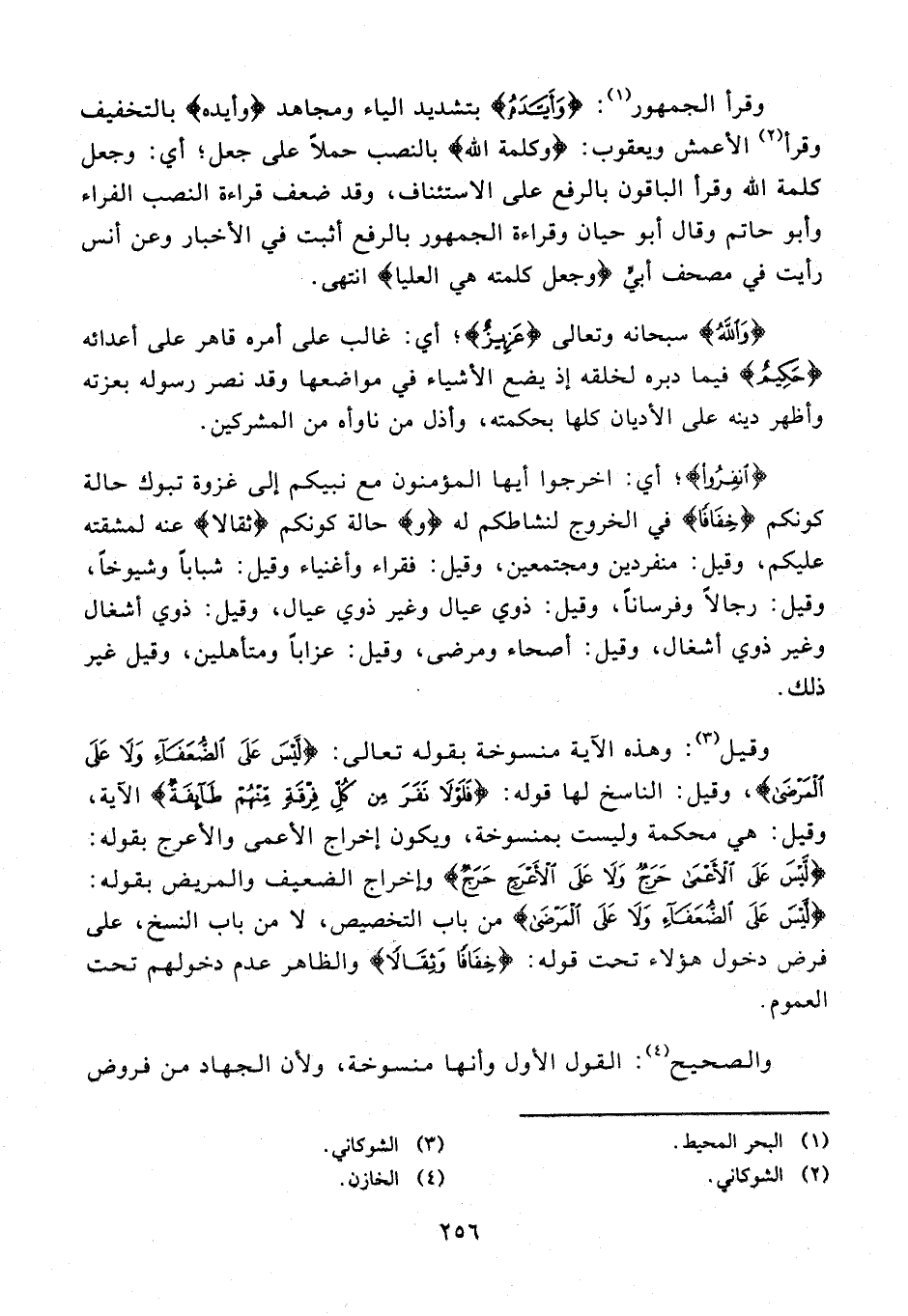 وقيل (¬3): وهذه الآية منسوخة بقوله تعالى: {لَيْسَ عَلَى الضُّعَفَاءِ وَلَا عَلَى الْمَرْضَى}، وقيل: الناسخ لها قوله: {فَلَوْلَا نَفَرَ مِنْ كُلِّ فِرْقَةٍ مِنْهُمْ طَائِفَةٌ} الآية، وقيل: هي محكمة وليست بمنسوخة، ويكون إخراج الأعمى والأعرج بقوله: {لَيْسَ عَلَى الْأَعْمَى حَرَجٌ وَلَا عَلَى الْأَعْرَجِ حَرَجٌ} وإخراج الضعيف والمريض بقوله: {لَيْسَ عَلَى الضُّعَفَاءِ وَلَا عَلَى الْمَرْضَى} من باب التخصيص، لا من باب النسخ، على فرض دخول هؤلاء تحت قوله: {خِفَافًا وَثِقَالًا}، والظاهر عدم دخولهم تحت العموم.