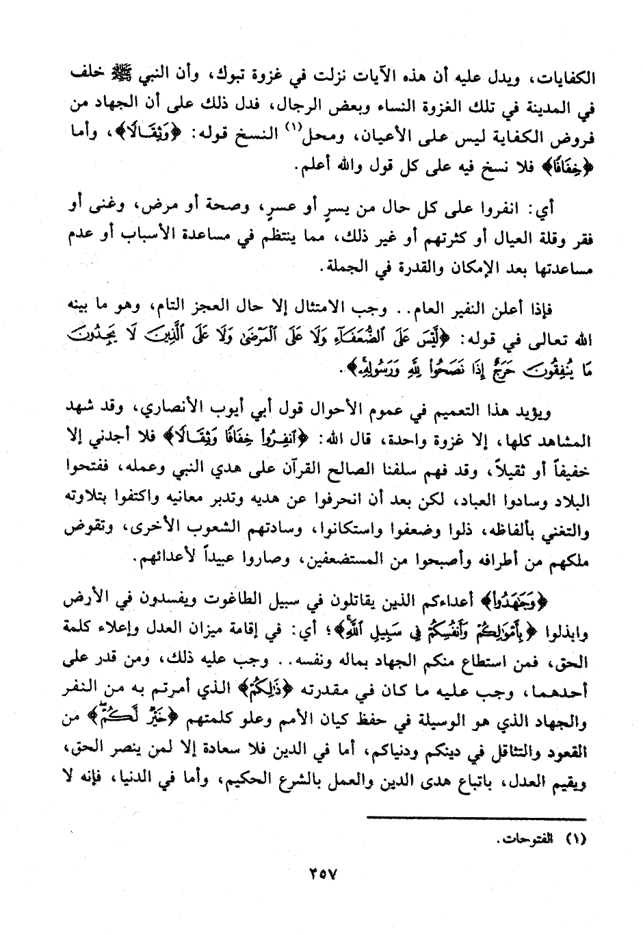 ويؤيد هذا التعميم في عموم الأحوال قول أبي أيوب الأنصاري، وقد شهد المشاهد كلها، إلا غزوة واحدة، قال الله: {انْفِرُوا خِفَافًا وَثِقَالًا} فلا أجدني إلا خفيفًا أو ثقيلًا، وقد فهم سلفنا الصالح القرآن على هدي النبي وعمله، ففتحوا البلاد وسادوا العباد، لكن بعد أن انحرفوا عن هديه وتدبر معانيه واكتفوا بتلاوته والتغني بألفاظه، ذلوا وضعفوا واستكانوا، وسادتهم الشعوب الأخرى، وتقوض ملكهم من أطرافه وأصبحوا من المستضعفين، وصاروا عبيدًا لأعدائهم.