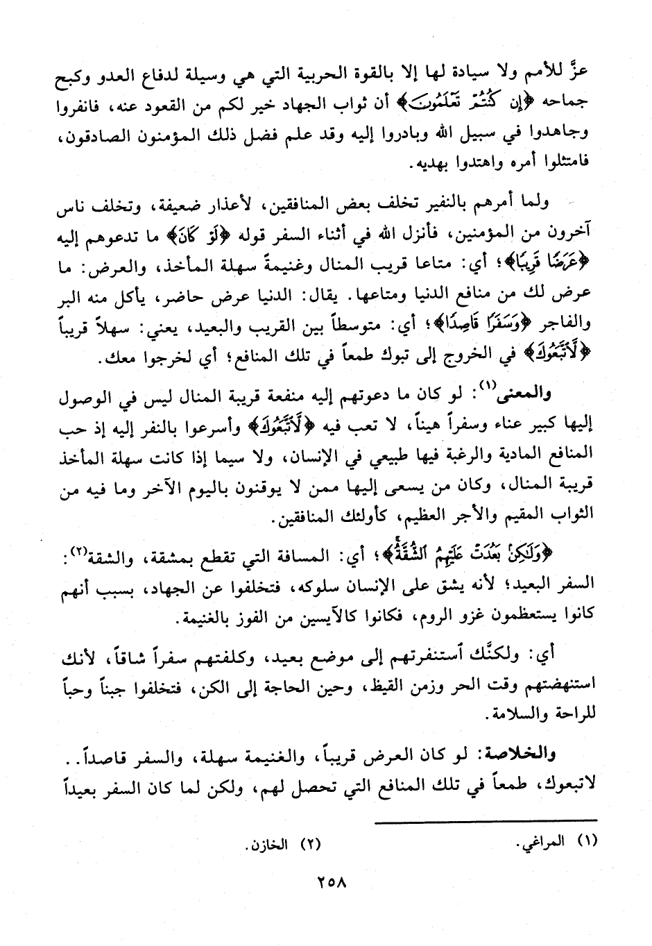 42 - ولما أمرهم بالنفير تخلف بعض المنافقين، لأعذار ضعيفة، وتخلف ناس آخرون من المؤمنين، فأنزل الله في أثناء السفر قوله {لَوْ كَانَ} ما تدعوهم إليه {عَرَضًا قَرِيبًا}؛ أي: متاعا قريب المنال وغنيمةً سهلة المأخذ، والعرض: ما عرض لك من منافع الدنيا ومتاعها. يقال: الدنيا عرض حاضر، يأكل منه البر والفاجر {وَسَفَرًا قَاصِدًا}؛ أي: متوسطًا بين القريب والبعيد، يعني: سهلًا قريبًا {لَاتَّبَعُوكَ} في الخروج إلى تبوك طمعًا في تلك المنافع؛ أي لخرجوا معك.