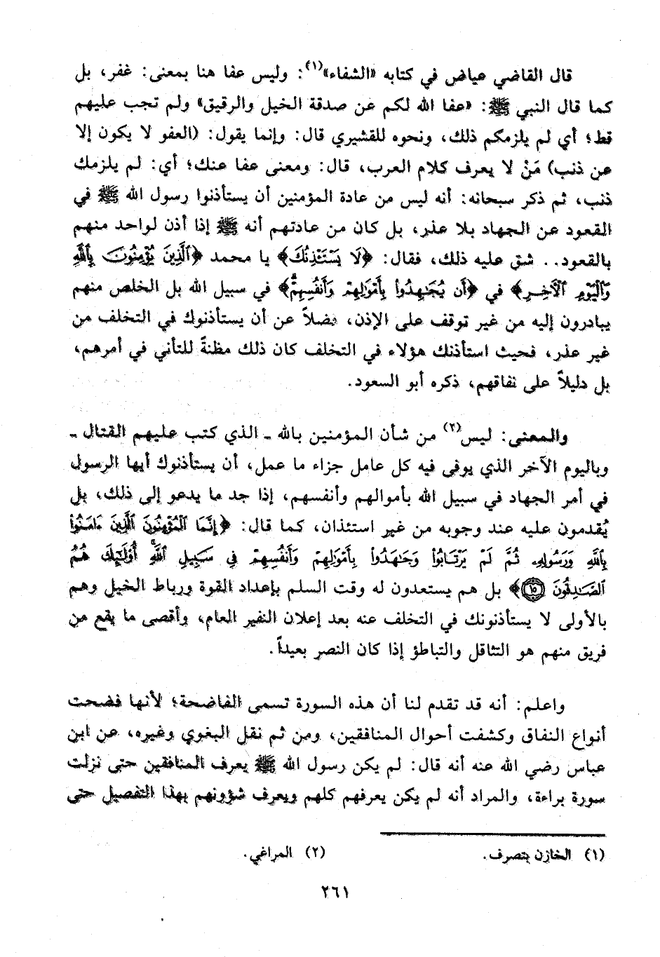 قال القاضي عياض في كتابه "الشفاء" (¬1): وليس عفا هنا بمعنى: غفر، بل كما قال النبي - صلى الله عليه وسلم -: "عفا الله لكم عن صدقة الخيل والرقيق" ولم تجب عليهم قط؛ أي لم يلزمكم ذلك، ونحوه للقشيري قال: وإنما يقول: (العفو لا يكون إلا عن ذنب) مَنْ لا يعرف كلام العرب، قال: ومعنى عفا عنك؛ أي: لم يلزمك ذنب،