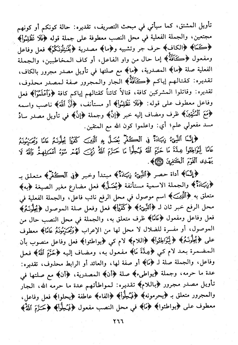تأويل المشتق، كما سيأتي في مبحث التصريف، تقديره: حالة كونكم أو كونهم مجتمعين، والجملة الفعلية في محل النصب معطوفة على جملة قوله {فَلَا تَظْلِمُواْ} {كَمَا} {الكاف} حرف جر وتشبيه و {ما} مصدرية {يُقَاتِلُونَكُمْ} فعل وفاعل ومفعول {كَافَّةً} إما حال من واو الفاعل، أو كاف المخاطبين، والجملة الفعلية صلة {ما} المصدرية، {ما} مع صلتها في تأويل مصدر مجرور بالكاف، تقديره: كقتالهم إياكم {كَافَّةً} الجار والمجرور صفة لمصدر محذوف، تقديره: وقاتلوا المشركين كافة، قتالًا كائنًا كقتالهم إياكم كافة {وَاعْلَمُوا} فعل وفاعل معطوف على قوله: {فَلَا تَظْلِمُوا} أو مستأنف، {أَنَّ اَللهَ} ناصب واسمه {مَعَ الْمُتَّقِينَ} ظرف ومضاف إليه خبر {إنَّ} وجملة {إنَّ} في تأويل مصدر سادٍّ مسد مفعولي علم؛ أي: واعلموا كون الله مع المتقين.