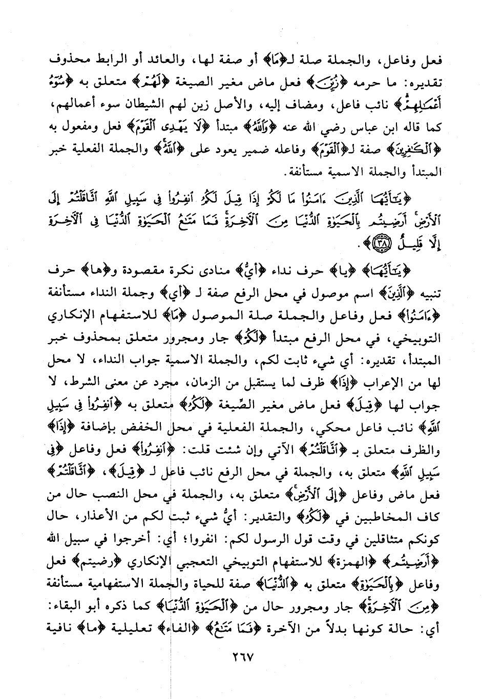 {يَا أَيُّهَا} {يا} حرف نداء {أيُّ} منادى نكرة مقصودة و {ها} حرف تنبيه {الَّذِينَ} اسم موصول في محل الرفع صفة لـ {أيُّ} وجملة النداء مستأنفة {آمَنُوا} فعل وفاعل والجملة صلة الموصول {مَا} للاستفهام الإنكاري التوبيخي، في محل الرفع مبتدأ {لَكُمْ} جار ومجرور متعلق بمحذوف خبر المبتدأ، تقديره: أي شيء ثابت لكم، والجملة الاسمية جواب النداء، لا محل لها من الإعراب {إِذَا} ظرف لما يستقبل من الزمان، مجرد عن معنى الشرط، لا جواب لها {قِيلَ} فعل ماض مغير الصِّيغة {لَكُمُ} متعلق به {انْفِرُوا فِي سَبِيلِ اللَّهِ} نائب فاعل محكي، والجملة الفعلية في محل الخفض بإضافة {إِذَا} والظرف متعلق بـ {اثَّاقَلْتُمْ} الآتي وإن شئت قلت: {انْفِرُواْ} فعل وفاعل {في سَبيلِ اللهِ} متعلق به، والجملة في محل الرفع نائب فاعل لـ {قِيلَ}، {اثَّاقَلْتُمْ} فعل ماض وفاعل {إِلَى الْأَرْضِ} متعلق به، والجملة في محل النصب حال من كاف المخاطبين في {لَكُمُ} والتقدير: أيُّ شيء ثبت لكم من الأعذار، حال كونكم متثاقلين في وقت قول الرسول لكم: انفروا؛ أي: أخرجوا في سبيل الله {أَرَضِيتُم} {الهمزة} للاستفهام التوبيخي التعجبي الإنكاري {رضيتم} فعل وفاعل {بِالْحَيَاةِ} متعلق به {الدُّنْيَا} صفة للحياة والجملة الاستفهامية مستأنفة {مِنَ الْآخِرَةِ} جار ومجرور حال من {الْحَيَاةِ الدُّنْيَا} كما ذكره أبو البقاء: أي: حالة كونها بدلًا من الآخرة {فَمَا مَتَاعُ} {الفاء} تعليلية {ما} نافية