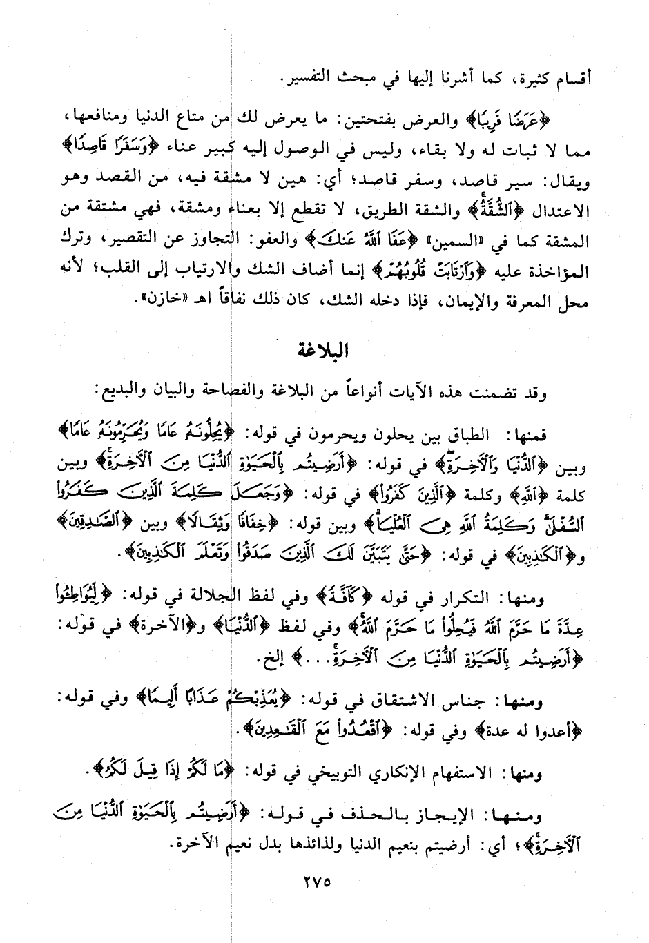 فمنها: الطباق بين يحلون ويحرمون في قوله: {يُحِلُّونَهُ عَامًا وَيُحَرِّمُونَهُ عَامًا} وبين {الدُّنْيَا مِنَ الْآخِرَةِ} في قوله: {أَرَضِيتُمْ بِالْحَيَاةِ الدُّنْيَا مِنَ الْآخِرَةِ} وبين كلمة {اللَّهُ} وكلمة {الَّذِينَ كَفَرُوا} في قوله: {وَجَعَلَ كَلِمَةَ الَّذِينَ كَفَرُوا السُّفْلَى وَكَلِمَةُ اللَّهِ هِيَ الْعُلْيَا} وبين قوله: {خِفَافًا وَثِقَالًا}، وبين {الصَّادِقِينَ} و {الْكَاذِبِينَ} في قوله: {حَتَّى يَتَبَيَّنَ لَكَ الَّذِينَ صَدَقُوا وَتَعْلَمَ الْكَاذِبِينَ}.
