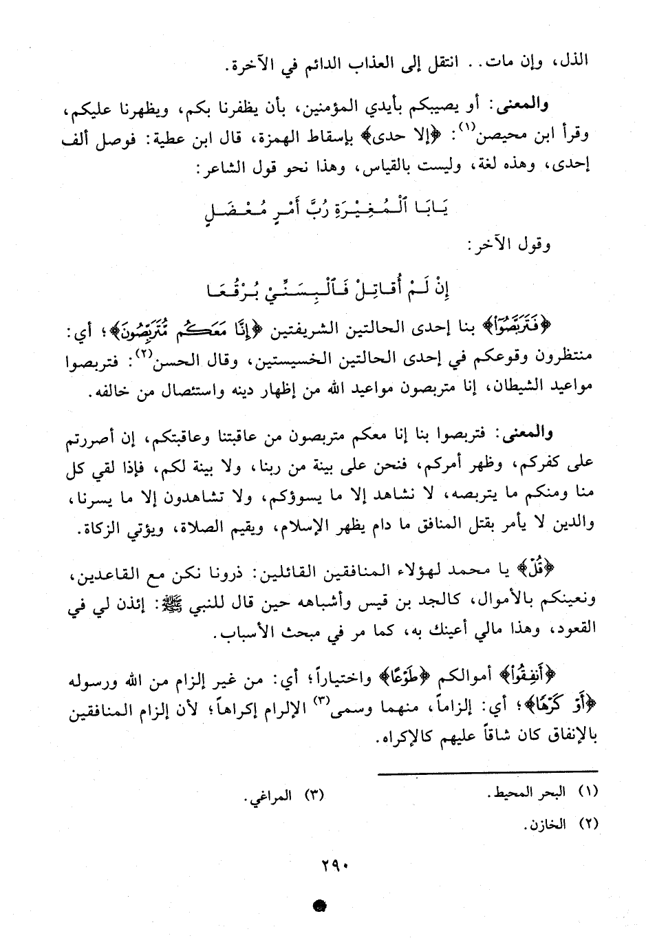 والمعنى: فتربصوا بنا إنا معكم متربصون من عاقبتنا وعاقبتكم، إن أصررتم على كفركم، وظهر أمركم، فنحن على بينة من ربنا، ولا بينة لكم، فإذا لقي كل منا ومنكم ما يتربصه، لا نشاهد إلا ما يسوؤكم، ولا تشاهدون إلا ما يسرنا، والدين لا يأمر بقتل المنافق ما دام يظهر الإسلام، ويقيم الصلاة، ويؤتي الزكاة.