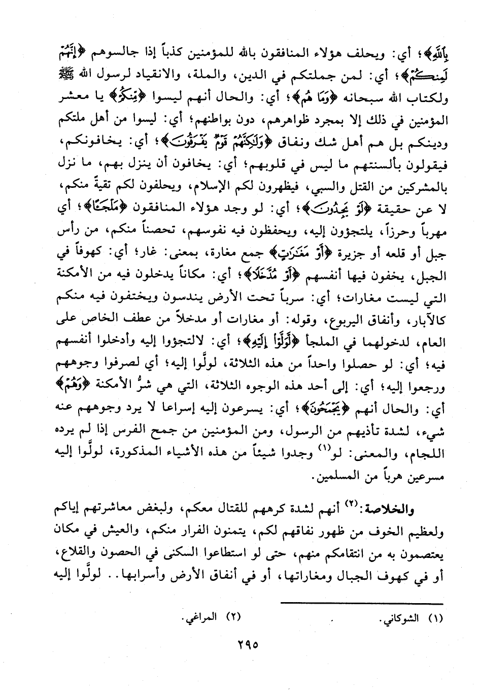 والخلاصة: (¬2) أنهم لشدة كرههم للقتال معكم، ولبغض معاشرتهم إياكم ولعظيم الخوف من ظهور نفاقهم لكم، يتمنون الفرار منكم، والعيش في مكان يعتصمون به من انتقاكم منهم، حتى لو استطاعوا السكنى في الحصون والقلاع، أو في كهوف الجبال ومغاراتها، أو في أنفاق الأرض وأسرابها .. لولَّوا إليه