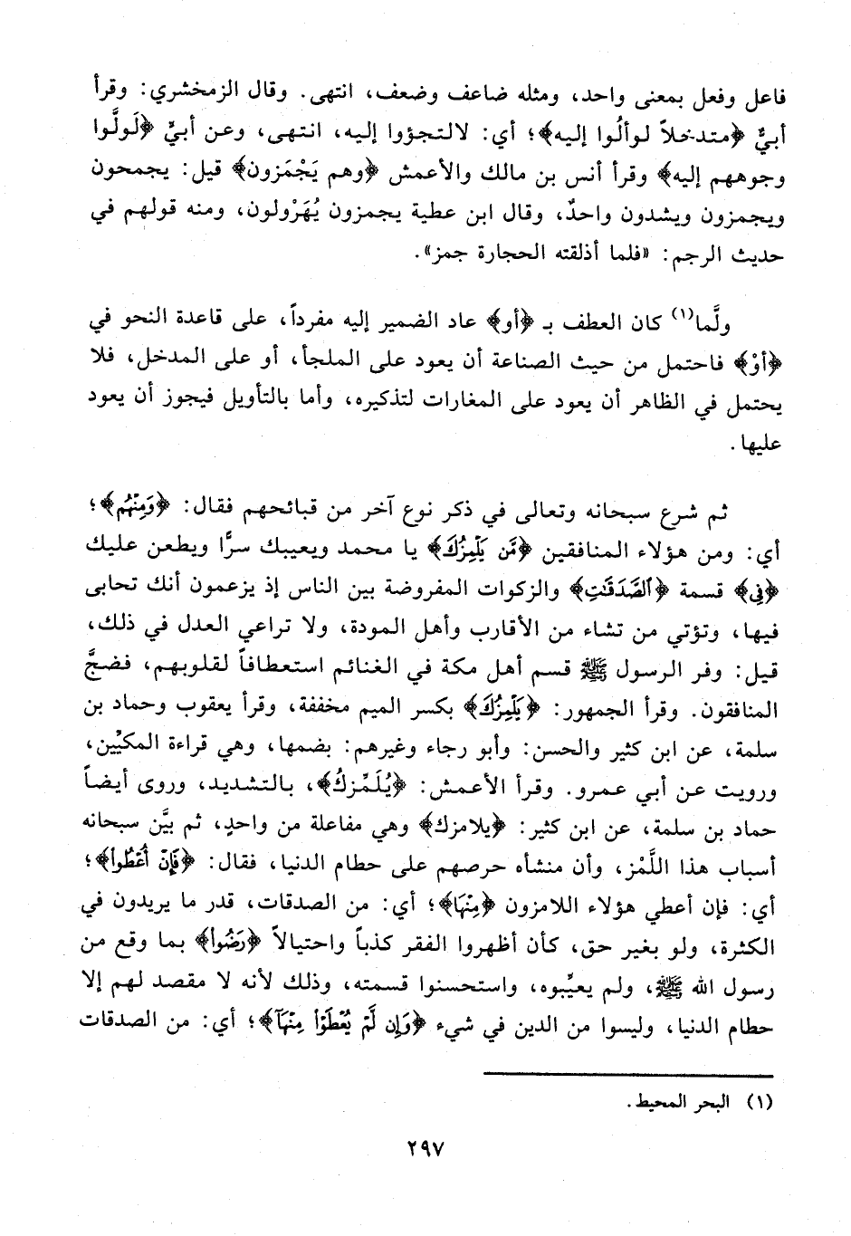 58 - ثم شرع سبحانه وتعالى في ذكر نوع آخر من قبائحهم فقال: {وَمِنْهُمْ}؛ أي: ومن هؤلاء المنافقين {مَنْ يَلْمِزُكَ} يا محمد ويعيبك سرًّا ويطعن عليك {فِي} قسمة {الصَّدَقَاتِ} والزكوات المفروضة بين الناس إذ يزعمون أنك تحابى فيها، وتؤتي من تشاء من الأقارب وأهل المودة، ولا تراعي العدل في ذلك، قيل: وفر الرسول - صلى الله عليه وسلم - قسم أهل مكة في الغنائم استعطافًا لقلوبهم، فضجَّ المنافقون. وقرأ الجمهور: {يَلْمِزُكَ} بكسر الميم مخففة، وقرأ يعقوب وحماد بن سلمة، عن ابن كثير والحسن: وأبو رجاء وغيرهم: بضمها، وهي قراءة المكيِّين، ورويت عن أبي عمرو. وقرأ الأعمش: {يُلَمِّزكُ}، بالتشديد، وروى أيضًا حماد بن سلمة، عن ابن كثير: {يلامزك} وهي مفاعلة من واحدٍ، ثم بيَّن سبحانه أسباب هذا اللَّمْز، وأن منشأه حرصهم على حطام الدنيا، فقال: {فَإِنْ أُعْطُوا}؛ أي: فإن أعطي هؤلاء اللامزون {مِنْهَا}؛ أي: من الصدقات، قدر ما يريدون في الكثرة، ولو بغير حق، كأن أظهروا الفقر كذبًا واحتيالًا {رَضُوا} بما وقع من رسول الله - صلى الله عليه وسلم -، ولم يعيِّبوه، واستحسنوا قسمته، وذلك لأنه لا مقصد لهم إلا حطام الدنيا، وليسوا من الدين في شيء {وَإِنْ لَمْ يُعْطَوْا مِنْهَا}؛ أي: من الصدقات