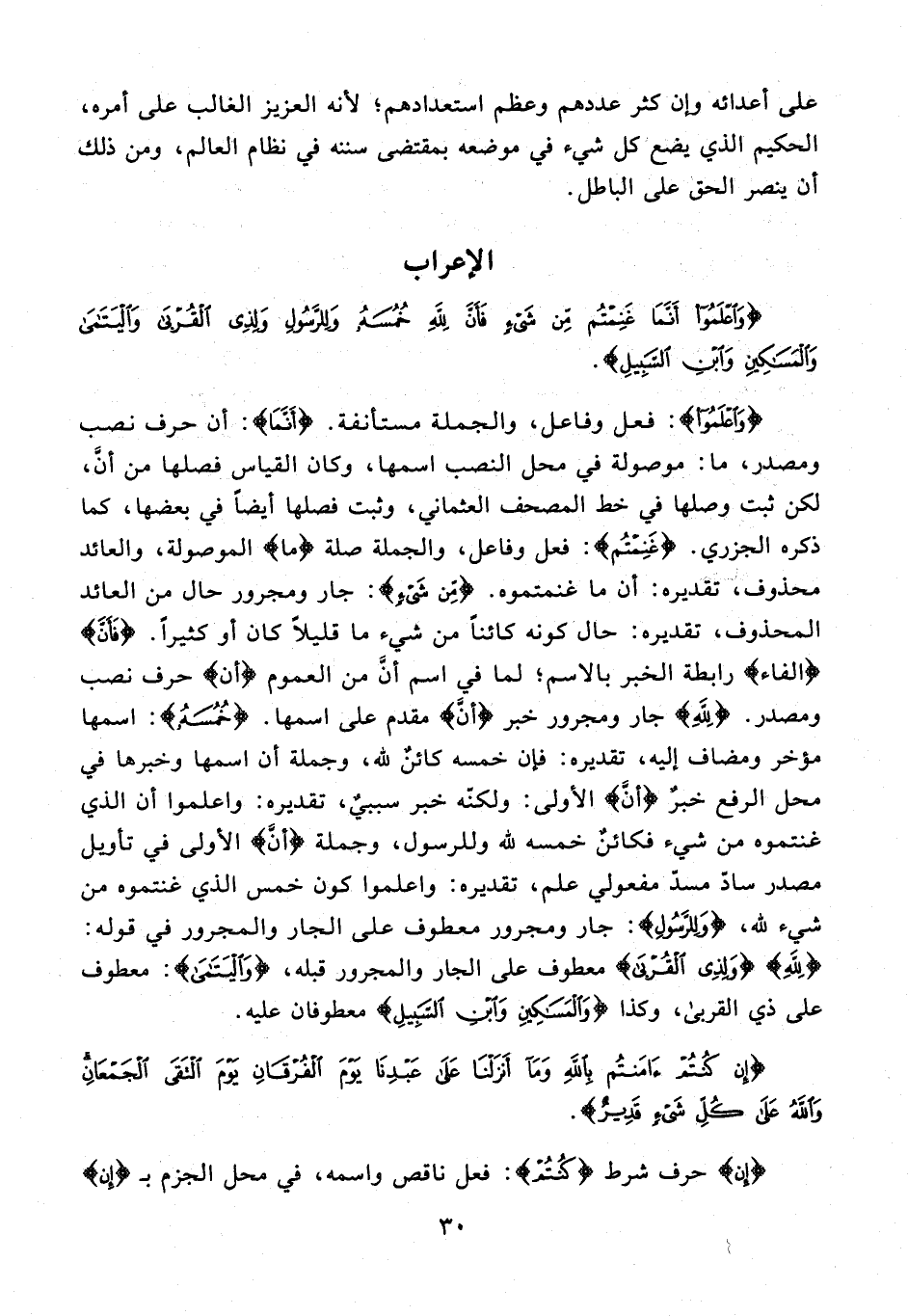 {وَاعْلَمُوا}: فعل وفاعل، والجملة مستأنفة. {أَنَّمَا}: أن حرف نصب ومصدر، ما: موصولة في محل النصب اسمها، وكان القياس فصلها من أنَّ، لكن ثبت وصلها في خط المصحف العثماني، وثبت فصلها أيضًا في بعضها، كما ذكره الجزري. {غَنِمْتُمْ}: فعل وفاعل، والجملة صلة {ما} الموصولة، والعائد محذوف، تقديره: أن ما غنمتموه. {مِنْ شَيْءٍ}: جار ومجرور حال من العائد المحذوف، تقديره: حال كونه كائنًا من شيء ما قليلًا كان أو كثيرًا. {فَأَنّ} {الفاء} رابطة الخبر بالاسم؛ لما في اسم أنَّ من العموم {أن} حرف نصب ومصدر. {لِلَّهِ} جار ومجرور خبر {أنَّ} مقدم على اسمها. {خُمُسَهُ}: اسمها مؤخر ومضاف إليه، تقديره: فإن خمسه كائنٌ لله، وجملة أن اسمها وخبرها في محل الرفع خبرٌ {أنَّ} الأولى: ولكنّه خبر سببيٌّ، تقديره: واعلموا أن الذي غنتموه من شيء فكائنٌ خمسه لله وللرسول، وجملة {أنَّ} الأولى في تأويل مصدر سادّ مسدّ مفعولي علم، تقديره: واعلموا كون خمس الذي غنتموه من شيء لله، {وَلِلرَّسُولِ}: جار ومجرور معطوف على الجار والمجرور في قوله: {لله} {وَلِذِي الْقُرْبَى} معطوف على الجار والمجرور قبله، {وَالْيَتَامَى}: معطوف على ذي القربى، وكذا {وَالْمَسَاكِينِ وَابْنِ السَّبِيلِ} معطوفان عليه.