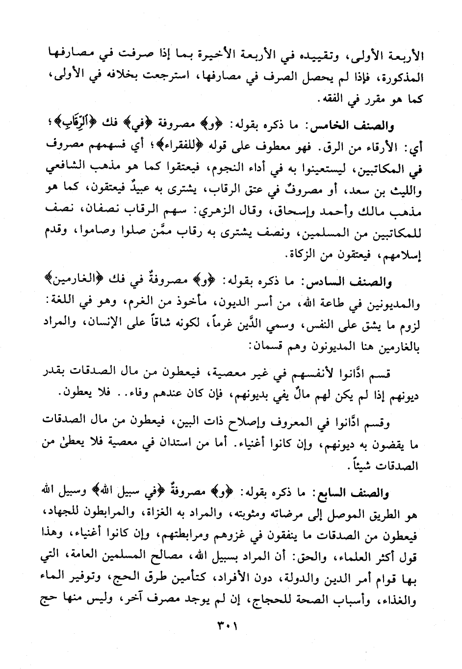 والصنف السادس: ما ذكره بقوله: {و} مصروفةٌ في فك {الغارمين} والمديونين في طاعة الله، من أسر الديون، مأخوذ من الغرم، وهو في اللغة: لزوم ما يشق على النفس، وسمي الدَّين غرمًا، لكونه شاقًّا على الإنسان، والمراد بالغارمين هنا المديونون وهم قسمان: