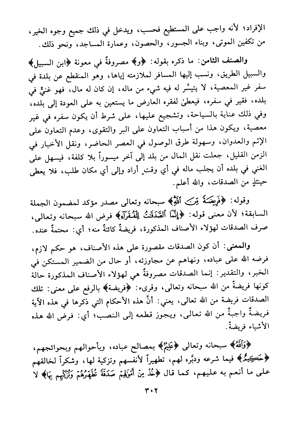 والصنف الثامن: ما ذكره بقوله: {و} مصروفةٌ في معونة {ابن السبيل} والسبيل الطريق، ونسب إليها المسافر لملازمته إياها، وهو المنقطع عن بلده في سفر غير المعصية، لا يتيسَّر له فيه شيء من ماله، إن كان له مال، فهو غنيٌّ في بلده، فقير في سفره، فيعطى لفقره العارض ما يستعين به على العودة إلى بلده، وفي ذلك عناية بالسياحة، وتشجيع عليها، على شرط أن يكون سفره في غير معصية، ويكون هذا من أسباب التعاون على البر والتقوى، وعدم التعاون على الإثم والعدوان، وسهولة طرق الوصول في العصر الحاضر، ونقل الأخبار في المؤمن القليل، جعلت نقل المال من بلد إلى آخر ميسورًا بلا كلفة، فيسهل على الغني في بلده أن يجلب ماله في أي وقتٍ أراد وإلى أي مكان طلب، فلا يعطى حينئذٍ من الصدقات، والله أعلم.
