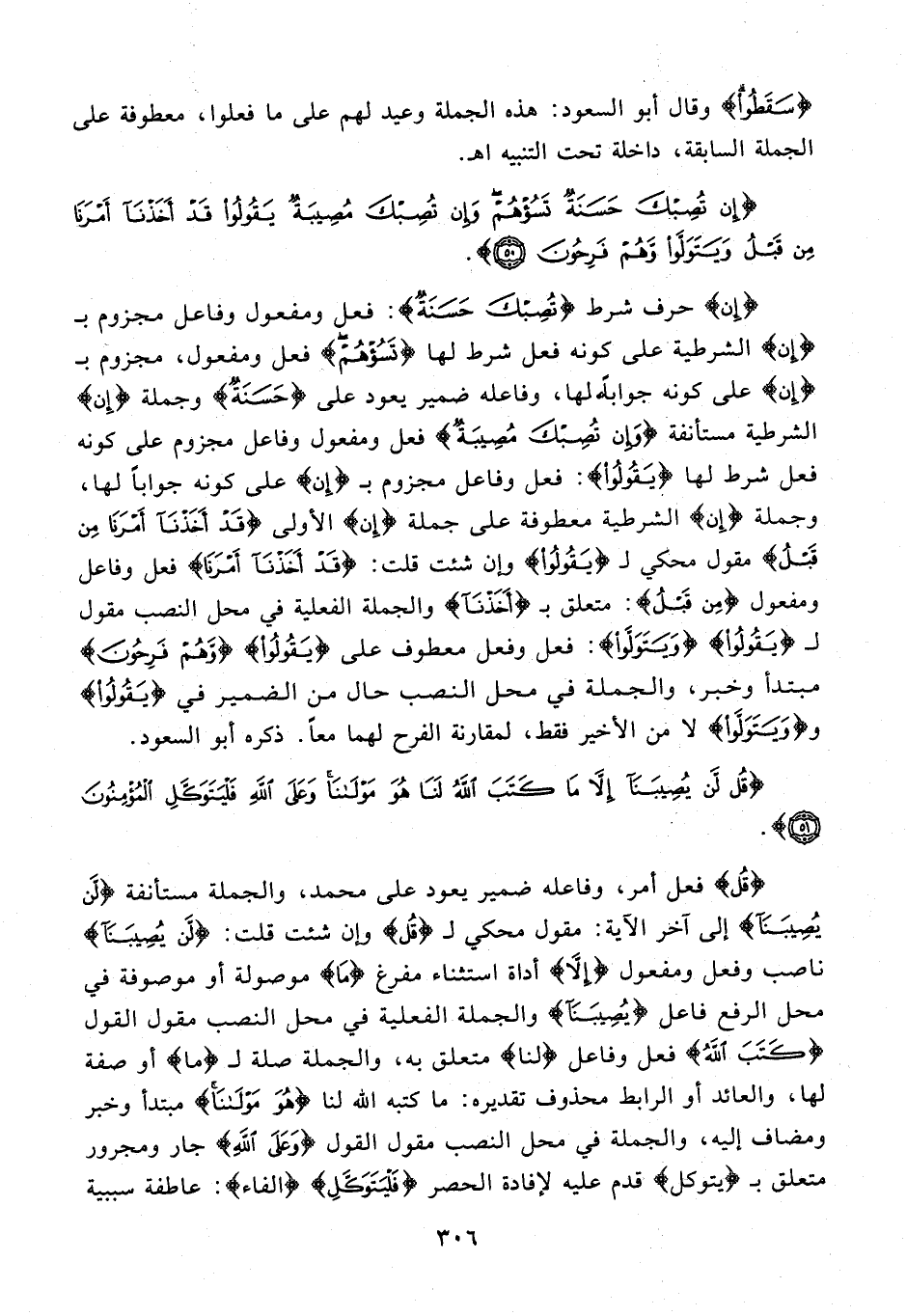 {إِن} حرف شرط {تُصِبْكَ حَسَنَةٌ}: فعل ومفعول وفاعل مجزوم بـ {إِن} الشرطية على كونه فعل شرط لها {تَسُؤْهُمْ} فعل ومفعول، مجزوم بـ {إِن} على كونه جوابًا لها، وفاعله ضمير يعود على {حَسَنَةٌ} وجملة {إِن} الشرطية مستأنفة {وَإِنْ تُصِبْكَ مُصِيبَةٌ} فعل ومفعول وفاعل مجزوم على كونه فعل شرط لها في {يَقُولُوا}: فعل وفاعل مجزوم بـ {إن} على كونه جوابًا لها، وجملة {إِن} الشرطية معطوفة على جملة {إِن} الأولى {قَدْ أَخَذْنَا أَمْرَنَا مِنْ قَبْلُ} مقول محكي لـ {يَقُولُوا} وإن شئت قلت: {قَدْ أَخَذْنَا أَمْرَنَا} فعل وفاعل ومفعول {مِنْ قَبْلُ}: متعلق بـ {أَخَذْنَا} والجملة الفعلية في محل النصب مقول لـ {يَقُولُوا} {وَيَتَوَلَّوْا}: فعل وفعل معطوف على {يَقُولُوا} {وَهُمْ فَرِحُونَ} مبتدأ وخبر، والجملة في محل النصب حال من الضمير في {يَقُولُوا} و {وَيَتَوَلَّوْا} لا من الأخير فقط، لمقارنة الفرح لهما معًا. ذكره أبو السعود.