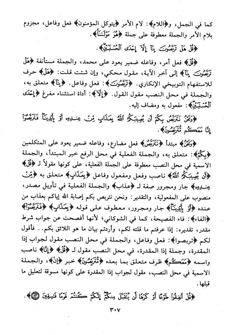 {قُلْ} فعل أمر، وفاعله ضمير يعود على محمد، والجملة مستأنفة {هَلْ تَرَبَّصُونَ بِنَا} إلى آخر الآية، مقول محكي، وإن شئت قلت: {هَلْ} حرف للاستفهام التوبيخي الإنكاري. {تَرَبَّصُونَ}: فعل وفاعل. {بِنَا} متعلق به، والجملة في محل النصب مقول القول. {إِلَّا}: أداة استثناء مفرغ {إِحْدَى الْحُسْنَيَيْنِ}: مفعول به ومضاف إليه.