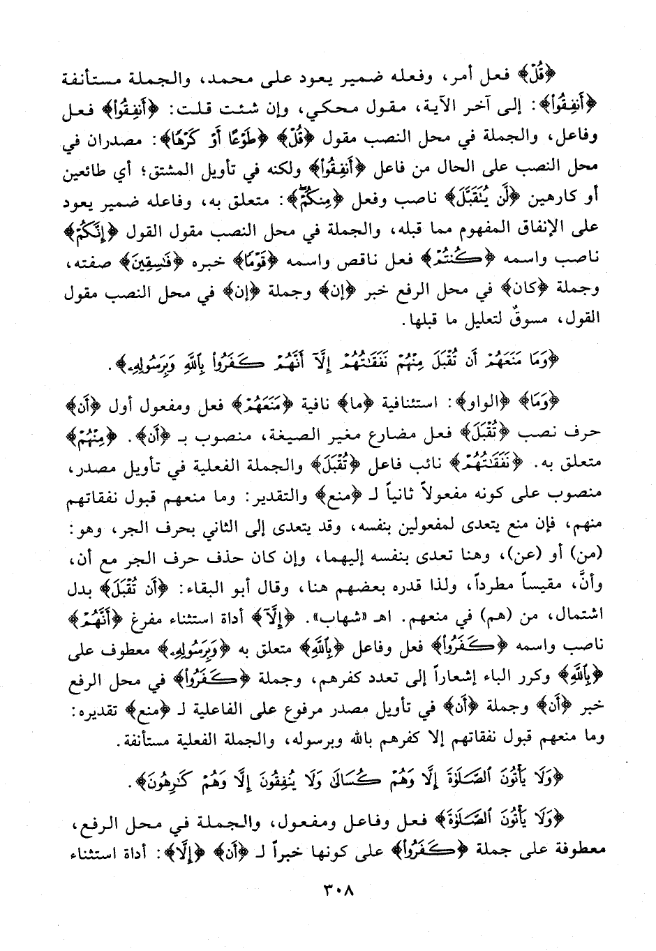 {وَمَا} {الواو}: استئنافية {ما} نافية {مَنَعَهُمْ} فعل ومفعول أول {أَن} حرف نصب {تُقْبَلَ} فعل مضارع مغير الصيغة، منصوب بـ {أَن}. {مِنْهُمْ} متعلق به. {نَفَقَاتُهُمْ} نائب فاعل {تُقْبَلَ} والجملة الفعلية في تأويل مصدر، منصوب على كونه مفعولًا ثانيًا لـ {منع} والتقدير: وما منعهم قبول نفقاتهم منهم، فإن منع يتعدى لمفعولين بنفسه، وقد يتعدى إلى الثاني بحرف الجر، وهو: (من) أو (عن)، وهنا تعدى بنفسه إليهما، وإن كان حذف حرف الجر مع أن، وأنَّ، مقيسًا مطردًا، ولذا قدره بعضهم هنا، وقال أبو البقاء: {أَنْ تُقْبَلَ} بدل اشتمال، من (هم) في منعهم. اهـ "شهاب". {إِلَّا} أداة استثناء مفرغ {أَنَّهُمْ} ناصب واسمه {كَفَرُوا} فعل وفاعل {بِاللَّهِ} متعلق به {وَبِرَسُولِهِ} معطوف على {بِاللَّهِ} وكرر الباء إشعارًا إلى تعدد كفرهم، وجملة {كَفَرُوا} في محل الرفع خبر {أَن} وجملة {أَن} في تأويل مصدر مرفوع على الفاعلية لـ {منع} تقديره: وما منعهم قبول نفقاتهم إلا كفرهم باللهِ وبرسوله، والجملة الفعلية مستأنفة.