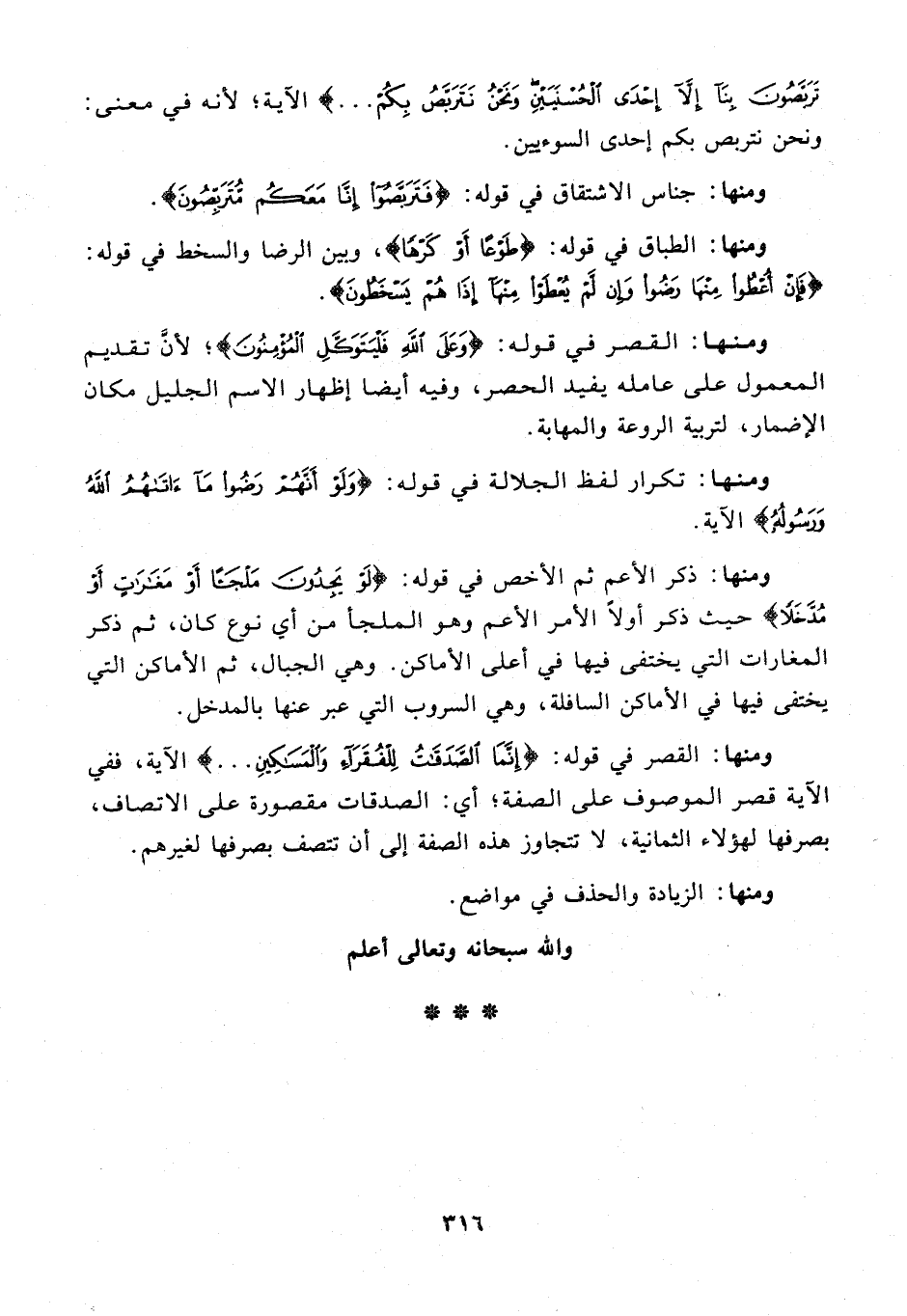 ومنها: القصر في قوله: {إِنَّمَا الصَّدَقَاتُ لِلْفُقَرَاءِ وَالْمَسَاكِينِ ...} الآية، ففي الآية قصر الموصوف على الصفة؛ أي: الصدقات مقصورة على الاتصاف، بصرفها لهؤلاء الثمانية، لا تتجاوز هذه الصفة إلى أن تتصف بصرفها لغيرهم.