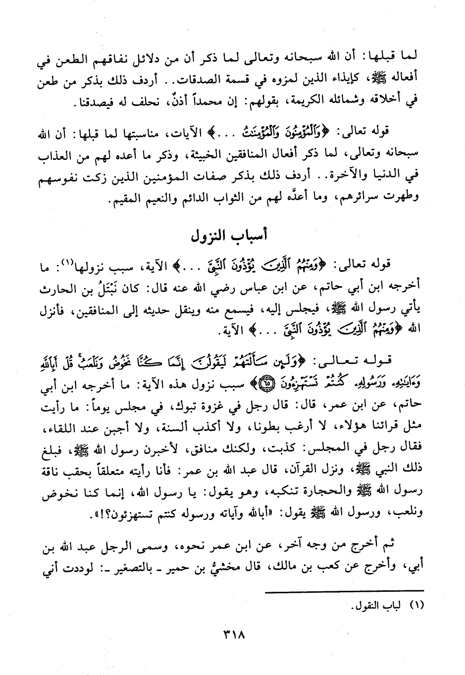 قوله تعالى: {وَلَئِنْ سَأَلْتَهُمْ لَيَقُولُنَّ إِنَّمَا كُنَّا نَخُوضُ وَنَلْعَبُ قُلْ أَبِاللَّهِ وَآيَاتِهِ وَرَسُولِهِ كُنْتُمْ تَسْتَهْزِئُونَ (65)} سبب نزول هذه الآية: ما أخرجه ابن أبي حاتم، عن ابن عمر، قال: قال رجل في غزوة تبوك، في مجلس يومًا: ما رأيت مثل قرائنا هؤلاء، لا أرغب بطونا، ولا أك ذب ألسنة، ولا أجبن عند اللقاء، فقال رجل في المجلس: كذبت، ولكنك منافق، لأخبرن رسول الله - صلى الله عليه وسلم -، فبلغ ذلك النبي - صلى الله عليه وسلم -، ونزل القرآن، قال عبد الله بن عمر: فأنا رأيته متعلقًا بحقب ناقة رسول الله - صلى الله عليه وسلم - والحجارة تنكبه، وهو يقول: يا رسول الله، إنما كنا نخوض ونلعب، ورسول الله - صلى الله عليه وسلم - يقول: "أبالله وآياته ورسوله كنتم تستهزئون؟! ".