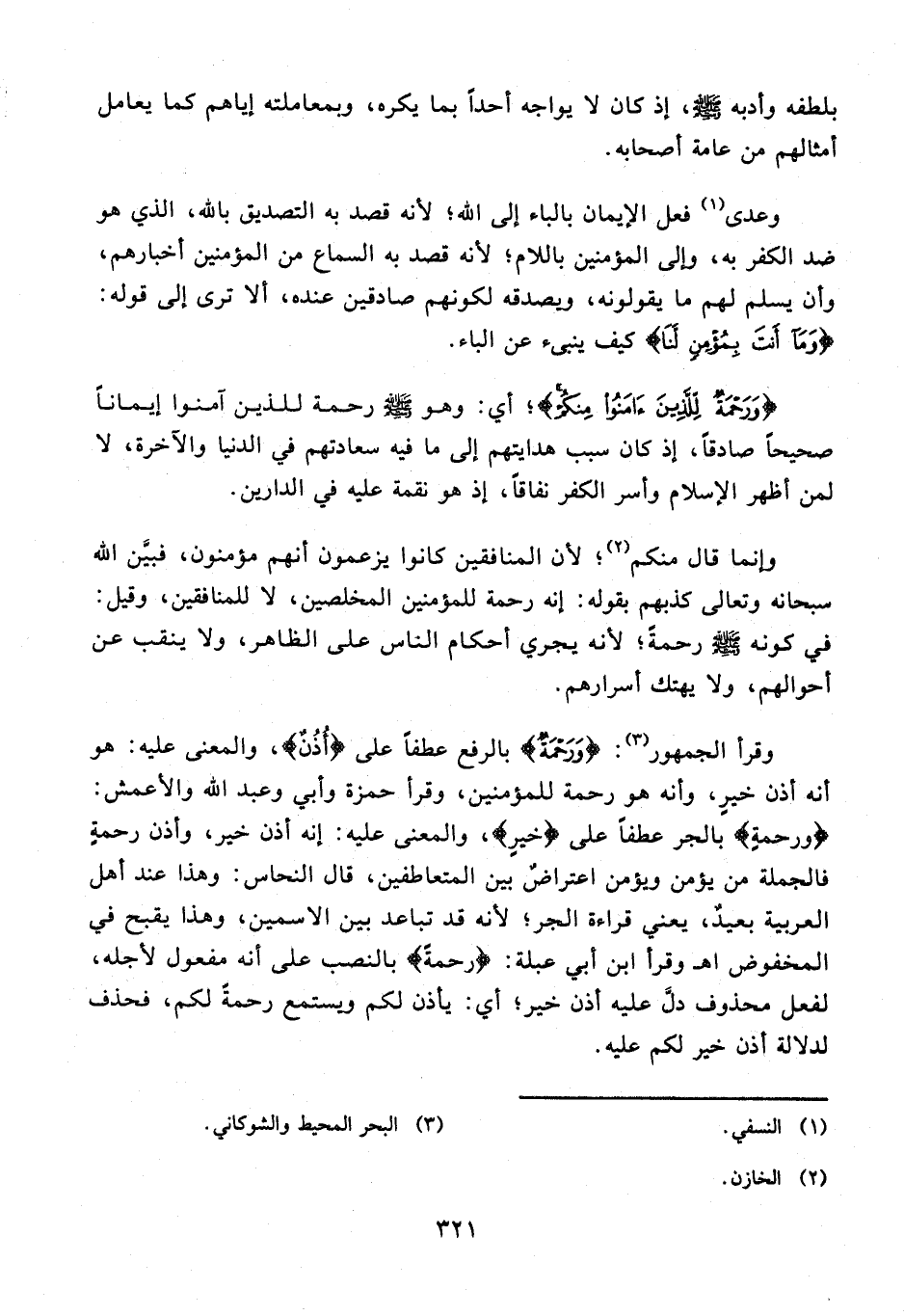 وقرأ الجمهور (¬3): {وَرَحْمَةٌ} بالرفع عطفًا على {أُذُنٌ}، والمعنى عليه: هو أنه أذن خيرٍ، وأنه هو رحمة للمؤمنين، وقرأ حمزة وأبي وعبد الله والأعمش: {ورحمةٍ} بالجر عطفًا على {خيرٍ}، والمعنى عليه: إنه أذن خير، وأذن رحمةٍ فالجملة من يؤمن ويؤمن اعتراضٌ بين المتعاطفين، قال النحاس: وهذا عند أهل العربية بعيدٌ، يعني قراءة الجر؛ لأنه قد تباعد بين الاسمين، وهذا يقبح في المخفوض اهـ وقرأ ابن أبي عبلة: {رحمةً} بالنصب على أنه مفعول لأجله، لفعل محذوف دلَّ عليه أذن خير؛ أي: يأذن لكم ويستمع رحمةً لكم، فحذف