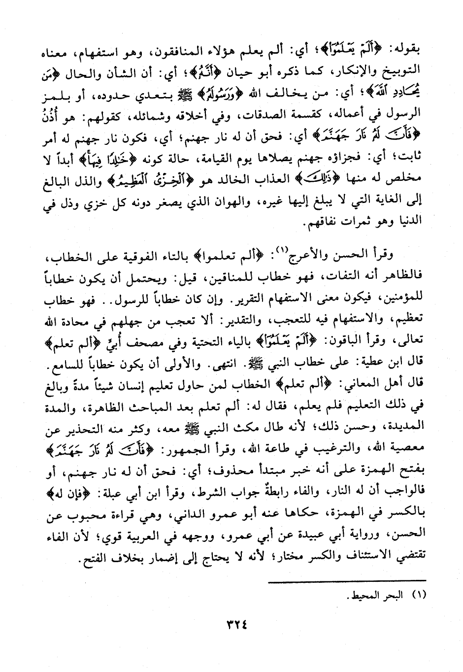 وقرأ الحسن والأعرج (¬1): {ألم تعلموا} بالتاء الفوقية على الخطاب، فالظاهر أنه التفات، فهو خطاب للمناقين، قيل: ويحتمل أن يكون خطابًا للمؤمنين، فيكون معنى الاستفهام التقرير. وإن كان خطابًا للرسول .. فهو خطاب تعظيم، والاستفهام فيه للتعجب، والتقدير: ألا تعجب من جهلهم في محادة الله تعالى، وقرأ الباقون: {أَلَمْ يَعْلَمُوا} بالياء التحتية وفي مصحف أُبيٍّ {ألم تعلم} قال ابن عطية: على خطاب النبي - صلى الله عليه وسلم -. انتهى. والأولى أن يكون خطابًا للسامع. قال أهل المعاني: {ألم تعلم} الخطاب لمن حاول تعليم إنسان شيئًا مدةً وبالغ في ذلك التعليم فلم يعلم، فقال له: ألم تعلم بعد المباحث الظاهرة، والمدة المديدة، وحسن ذلك؛ لأنه طال مكث النبي - صلى الله عليه وسلم - معه، وكثر منه التحذير عن معصية الله، والترغيب في طاعة الله، وقرأ الجمهور: {فَأَنَّ لَهُ نَارَ جَهَنَّمَ} بفتح الهزة على أنه خبر مبتدأ محذوف؛ أي: فحق أن له نار جهنم، أو فالواجب أن له النار، والفاء رابطةٌ جواب الشرط، وقرأ ابن أبي عبلة: {فإن له} بالكسر في الهمزة، حكاها عنه أبو عمرو الداني، وهي قراءة محبوب عن الحسن، ورواية أبي عبيدة عن أبي عمرو، ووجهه في العربية قوي؛ لأن الفاء تقتضي الاستئناف والكسر مختار؛ لأنه لا يحتاج إلى إضمار بخلاف الفتح.