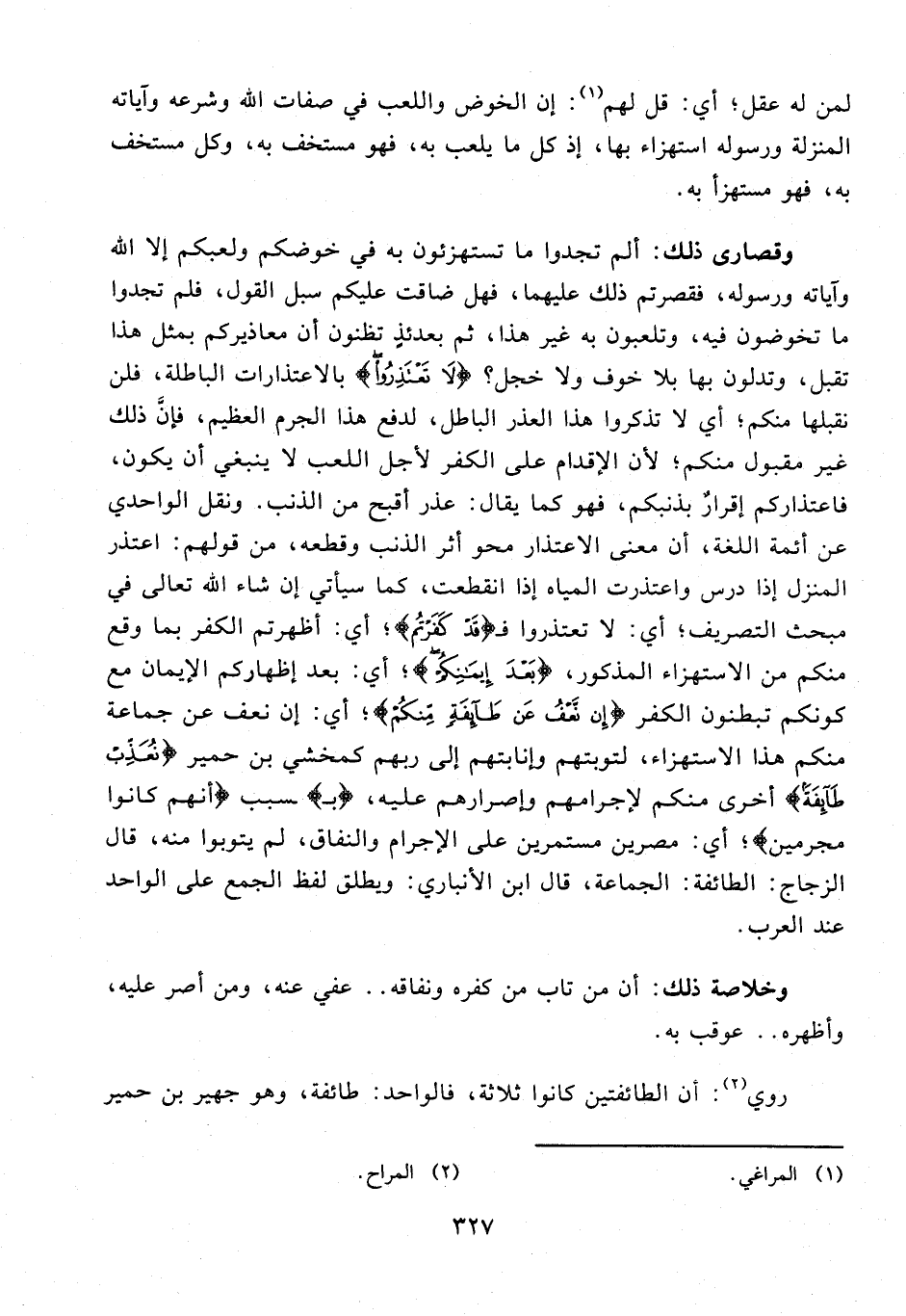 66 - {لَا تَعْتَذِرُوا} بالاعتذارات الباطلة، فلن نقبلها منكم؛ أي لا تذكروا هذا العذر الباطل، لدفع هذا الجرم العظيم، فإنَّ ذلك غير مقبول منكم؛ لأن الإقدام على الكفر لأجل اللعب لا ينبغي أن يكون، فاعتذاركم إقرارٌ بذنبكم، فهو كما يقال: عذر أقبح من الذنب. ونقل الواحدي عن أئمة اللغة، أن معنى الاعتذار هو أثر الذنب وقطعه، من قولهم: اعتذر المنزل إذا درس واعتذرت المياه إذا انقطعت، كما سيأتي إن شاء الله تعالى في مبحث التصريف؛ أي: لا تعتذروا فـ {قَدْ كَفَرْتُمْ}؛ أي: أظهرتم الكفر بما وقع منكم من الاستهزاء المذكور، {بَعْدَ إِيمَانِكُمْ}؛ أي: بعد إظهاركم الإيمان مع كونكم تبطنون الكفر {إِنْ نَعْفُ عَنْ طَائِفَةٍ مِنْكُمْ}؛ أي: إن نعف عن جماعة منكم هذا الاستهزاء، لتوبتهم وإنابتهم إلى ربهم كمخشي بن حمير {نُعَذِّبْ طَائِفَةً} أخرى منكم لإجرامهم وإصرارهم عليه، {بـ} سبب {أنهم كانوا مجرمين}؛ أي: مصرين مستمرين على الإجرام والنفاق، لم يتوبوا منه، قال الزجاج: الطائفة: الجماعة، قال ابن الأنباري: ويطلق لفظ الجمع على الواحد عند العرب.