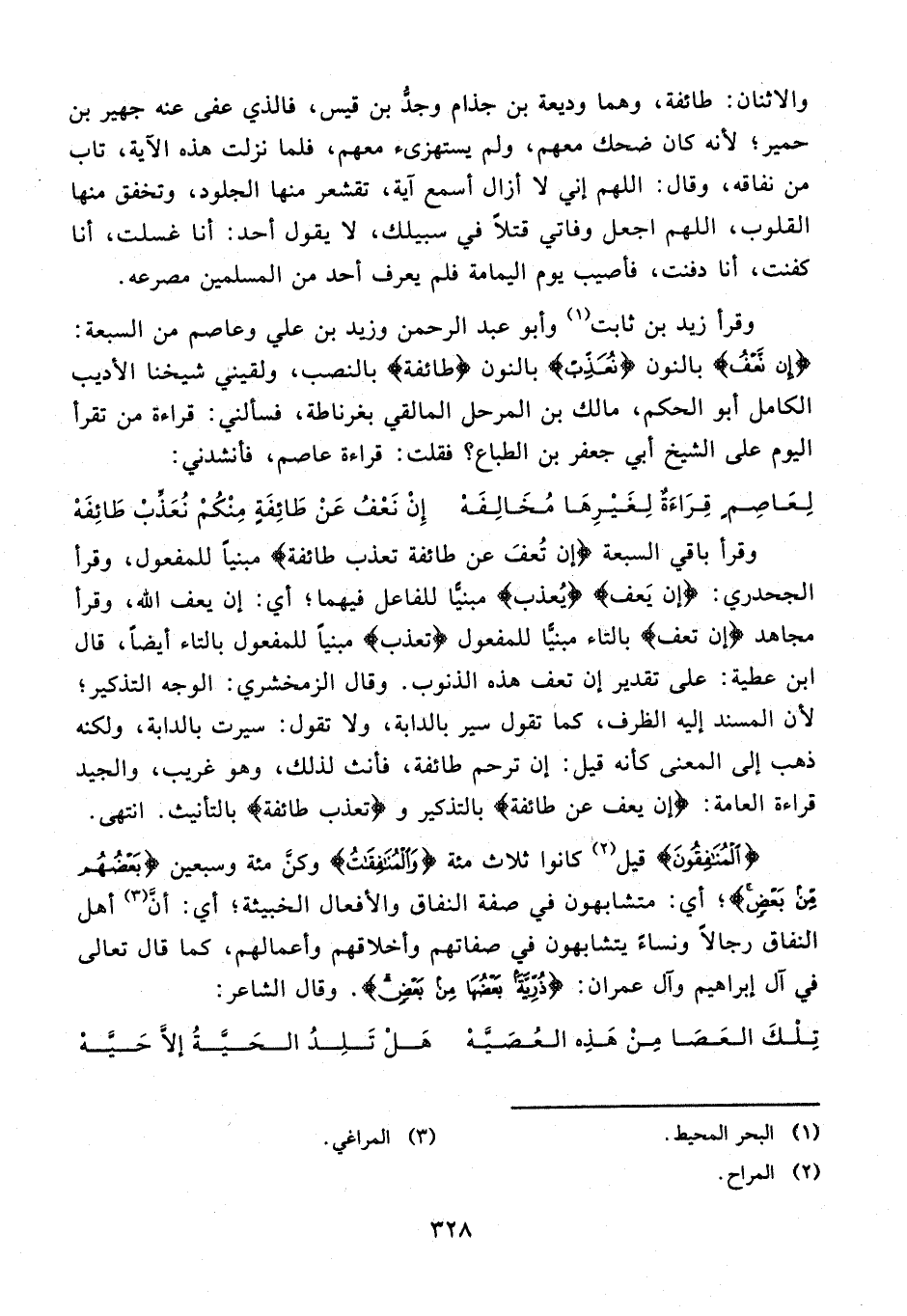 لِعاصِمٍ قِرَاءَةٌ لِغَيْرِهَا مُخَالِفَهْ ... إِنْ نَعْفُ عَنْ طَائِفَةٍ مِنْكُمْ نُعَذِّبْ طَائِفَهْ