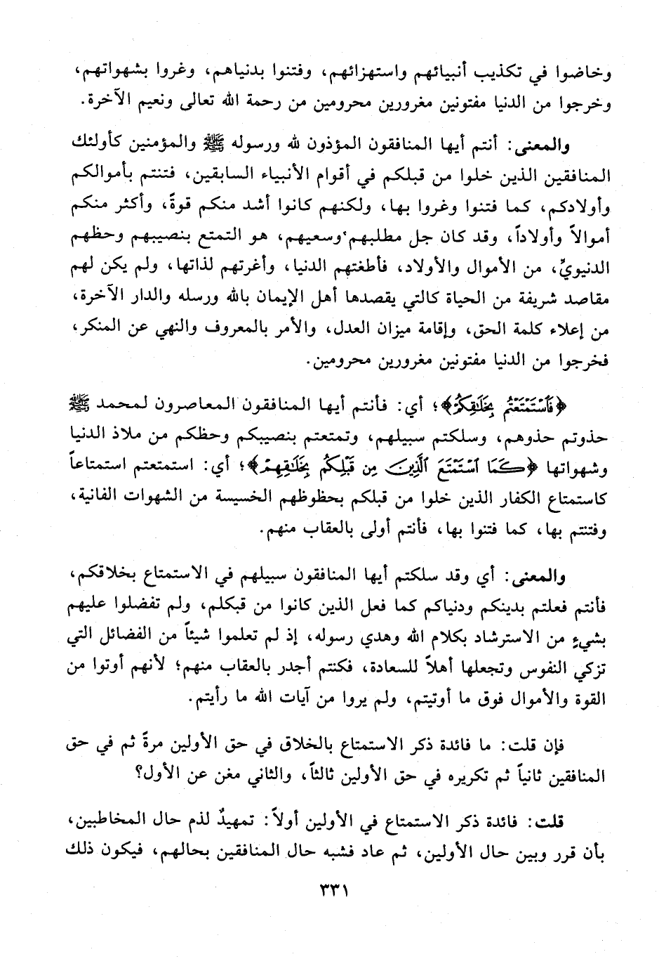 والمعنى: أي وقد سلكتم أيها المنافقون سبيلهم في الاستمتاع بخلاقكم، فأنتم فعلتم بدينكم ودنياكم كما فعل الذين كانوا من قبلكم، ولم تفضلوا عليهم بشيءٍ من الاسترشاد بكلام الله وهدي رسوله، إذ لم تعلموا شيئًا من الفضائل التي تزكي النفوس وتجعلها أهلًا للسعادة، فكنتم أجدر بالعقاب منهم؛ لأنهم أوتوا من القوة والأموال فوق ما أوتيتم، ولم يروا من آيات الله ما رأيتم.