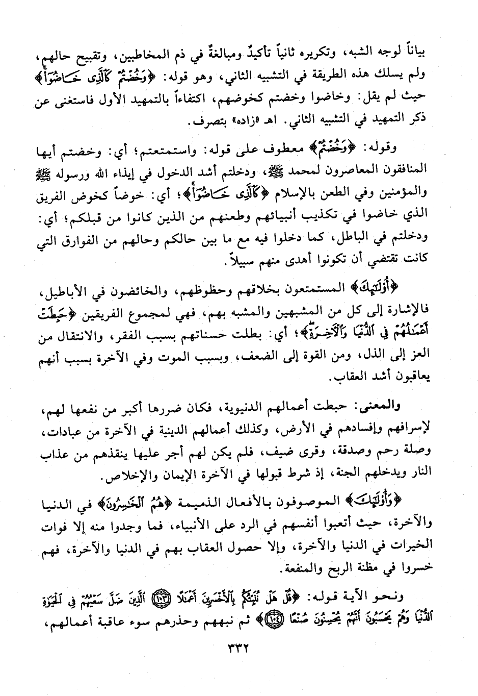 بيانًا لوجه الشبه، وتكريره ثانيًا تأكيدٌ ومبالغةٌ في ذم المخاطبين، وتقبيح حالهم، ولم يسلك هذه الطريقة في التشبيه الثاني، وهو قوله: {وَخُضْتُمْ كَالَّذِي خَاضُوا} حيث لم يقل: وخاضوا وخضتم كخوضهم، اكتفاءًا بالتمهيد الأول فاستغنى عن ذكر التمهيد في التشبيه الثاني. اهـ "زاده" بتصرف.