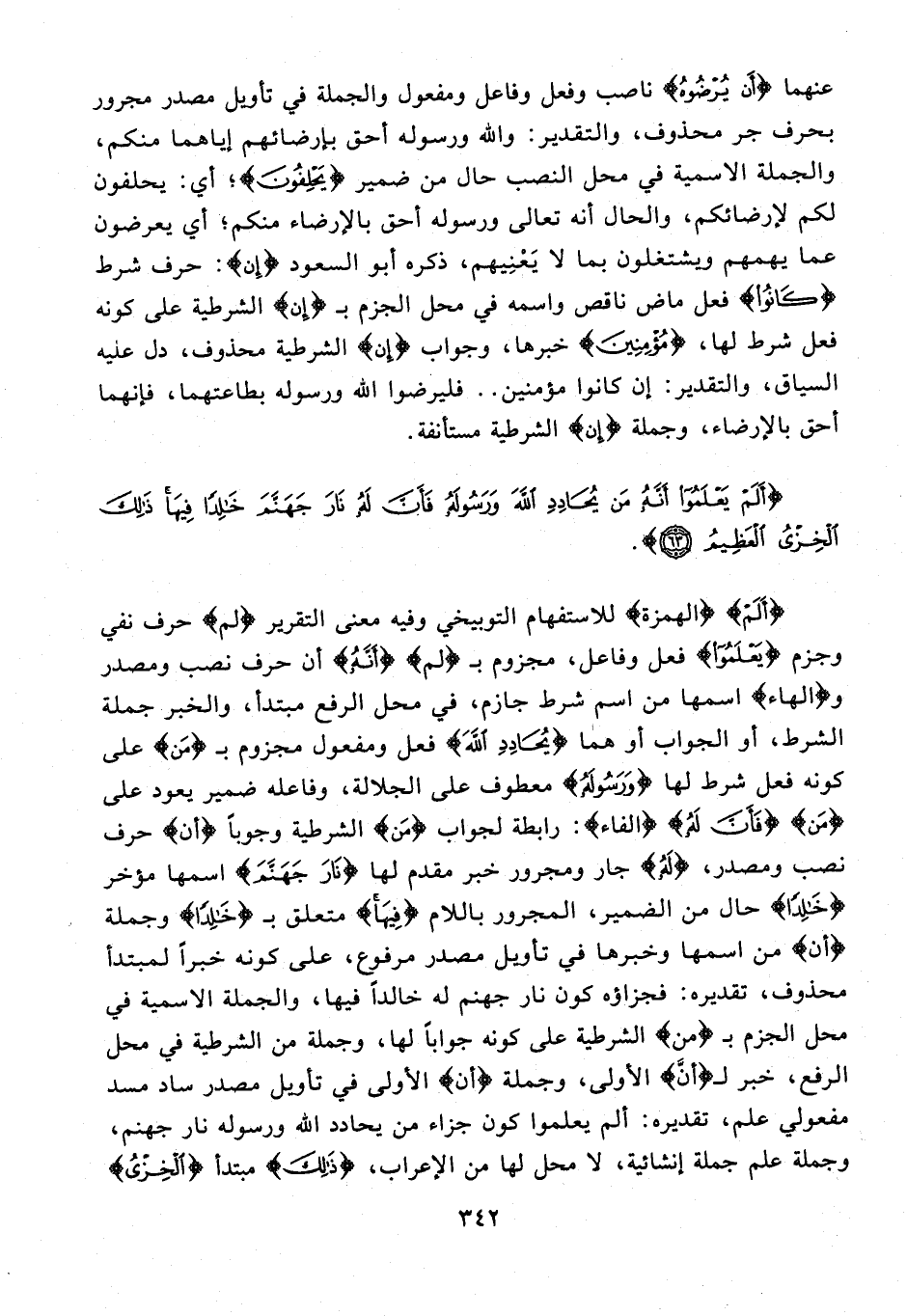 {أَلَمْ} {الهمزة} للاستفهام التوبيخي وفيه معنى التقرير {لم} حرف نفي وجزم {يَعْلَمُوا} فعل وفاعل، مجزوم بـ {لم} {أَنَّهُ} أن حرف نصب ومصدر و {الهاء} اسمها من اسم شرط جازم، في محل الرفع مبتدأ، والخبر جملة الشرط، أو الجواب أو هما {يُحَادِدِ اللَّهَ} فعل ومفعول مجزوم بـ {مَن} على كونه فعل شرط لها {وَرَسُولَهُ} معطوف على الجلالة، وفاعله ضمير يعود على {مَن} {فَأَنَّ لَهُ} {الفاء}: رابطة لجواب {مَن} الشرطية وجوبًا {أن} حرف نصب ومصدر، {لَهُ} جار ومجرور خبر مقدم لها {نَارَ جَهَنَّمَ} اسمها مؤخر {خَالِدًا} حال من الضمير، المجرور باللام {فِيهَا} متعلق بـ {خَالِدًا} وجملة {أن} من اسمها وخبرها في تأويل مصدر مرفوع، على كونه خبرًا لمبتدأ محذوف، تقديره: فجزاؤه كون نار جهنم له خالدًا فيها، والجملة الاسمية في محل الجزم بـ {من} الشرطية على كونه جوابًا لها، وجملة من الشرطية في محل الرفع، خبر لـ {أنَّ} الأولى، وجملة {أن} الأولى في تأويل مصدر ساد مسد مفعولي علم، تقديره: ألم يعلموا كون جزاء من يحادد الله ورسوله نار جهنم، وجملة علم جملة إنشائية، لا محل لها من الإعراب، {ذَلِكَ} مبتدأ {الْخِزْيُ}