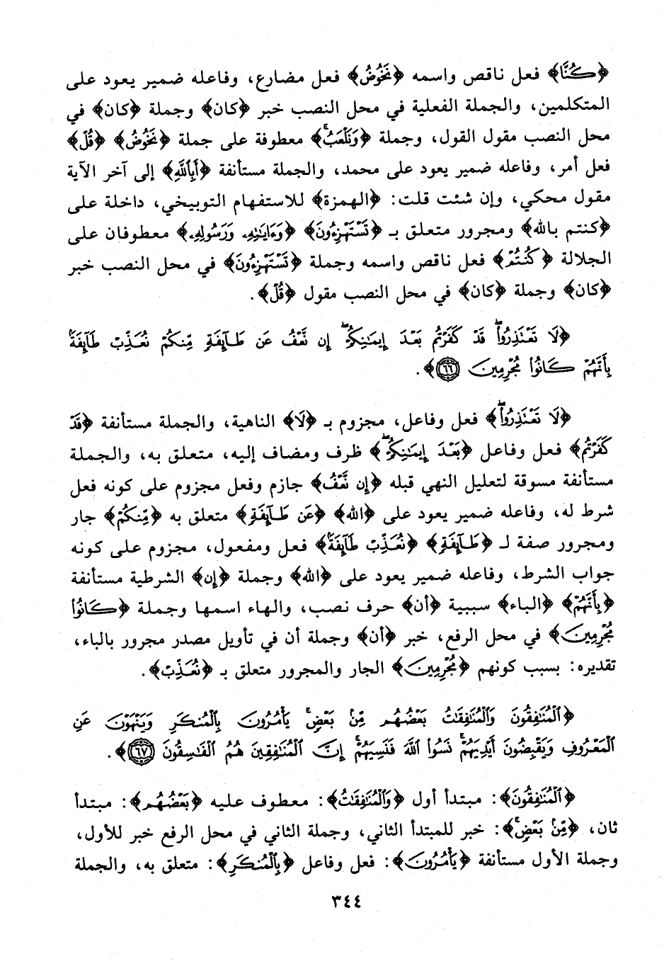 {لَا تَعْتَذِرُوا} فعل وفاعل، مجزوم بـ {لَا} الناهية، والجملة مستأنفة {قَدْ كَفَرْتُمْ} فعل وفاعل {بَعْدَ إِيمَانِكُمْ} ظرف ومضاف إليه، متعلق به، والجملة مستأنفة مسوقة لتعليل النهي قبله {إِنْ نَعْفُ} جازم وفعل مجزوم على كونه فعل شرط له، وفاعله ضمير يعود على {الله} {عَنْ طَائِفَةٍ} متعلق به {مِنْكُمْ} جار ومجرور صفة لـ {طَائِفَةٍ} {نُعَذِّبْ طَائِفَةً} فعل ومفعول، مجزوم على كونه جواب الشرط، وفاعله ضمير يعود على {الله} وجملة {إِن} الشرطية مستأنفة {بِأَنَّهُمْ} {الباء} سببية {أن} حرف نصب، والهاء اسمها وجملة {كَانُوا مُجْرِمِينَ} في محل الرفع، خبر {أن} وجملة أن في تأويل مصدر مجرور بالباء، تقديره: بسبب كونهم {مُجْرِمِينَ} الجار والمجرور متعلق بـ {نُعَذِّبْ}.
