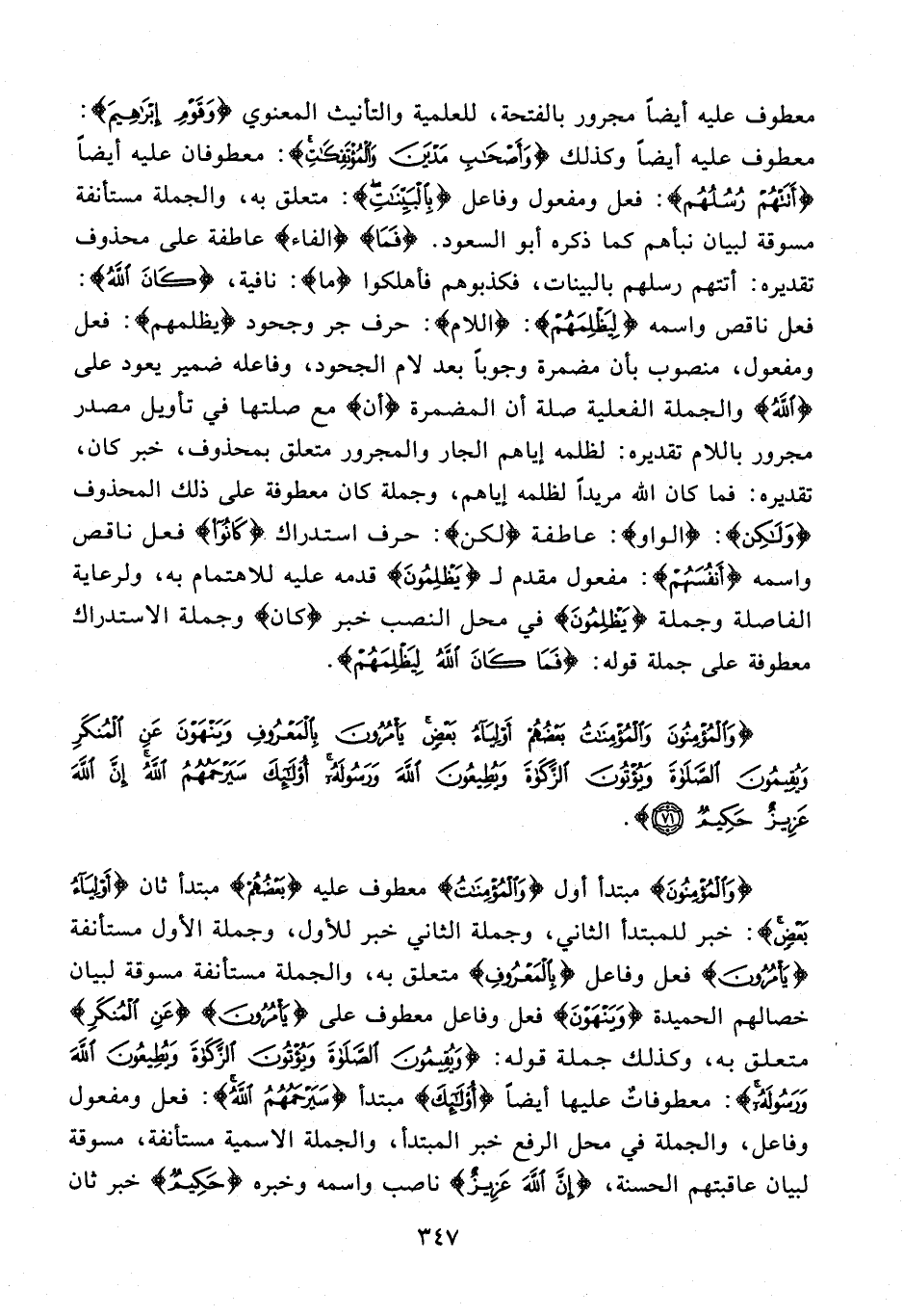 {وَالْمُؤْمِنُونَ} مبتدأ أول {وَالْمُؤْمِنَاتُ} معطوف عليه {بَعْضُهُمْ} مبتدأ ثان {أَوْلِيَاءُ بَعْضٍ}: خبر للمبتدأ الثاني، وجملة الثاني خبر للأول، وجملة الأول مستأنفة {يَأْمُرُونَ} فعل وفاعل {بِالْمَعْرُوفِ} متعلق به، والجملة مستأنفة مسوقة لبيان خصالهم الحميدة {وَيَنْهَوْنَ} فعل وفاعل معطوف على {يَأْمُرُونَ} {عن الْمُنْكَرِ} متعلق به، وكذلك جملة قوله: {وَيُقِيمُونَ الصَّلَاةَ وَيُؤْتُونَ الزَّكَاةَ وَيُطِيعُونَ اللَّهَ وَرَسُولَهُ}: معطوفاتٌ عليها أيضًا {أُولَئِكَ} مبتدأ {سَيَرْحَمُهُمُ اللَّهُ}: فعل ومفعول وفاعل، والجملة في محل الرفع خبر المبتدأ، والجملة الاسمية مستأنفة، مسوقة لبيان عاقبتهم الحسنة، {إِنَّ اللَّهَ عَزِيزٌ} ناصب واسمه وخبره {حَكِيمٌ} خبر ثان