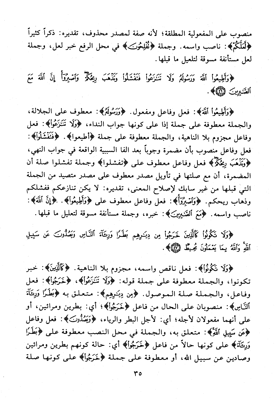 {وَأَطِيعُوا اللَّهَ}: فعل وفاعل ومفعول. {وَرَسُولَهُ}: معطوف على الجلالة، والجملة معطوفة على جملة إذا على كونها جواب النداء، {وَلَا تَنَازَعُوا}: فعل وفاعل مجزوم بلا الناهية، والجملة معطوفة على جملة {وَأَطِيعُوا}. {فَتَفْشَلُوا}: فعل وفاعل منصوب بأن مضمرة وجوبًا بعد الفاء السببية الواقعة في جواب النهي، {وَتَذْهَبَ رِيحُكُمْ} فعل وفاعل معطوف على {تفشلوا} وجملة تفشلوا صلة أن المضمرة، أن مع صلتها في تأويل مصدر معطوف على مصدر متصيد من الجملة التي قبلها من غير سابك لإصلاح المعنى، تقديره: لا يكن تنازعكم ففشلكم وذهاب ريحكم. {وَاصْبِرُوا}: فعل وفاعل معطوف على {وَأَطِيعُوا} .. {إِنَّ اللَّهَ}: ناصب واسمه. {مَعَ الصَّابِرِينَ}: خبره، وجملة مستأنفة مسوقة لتعليل ما قبلها.