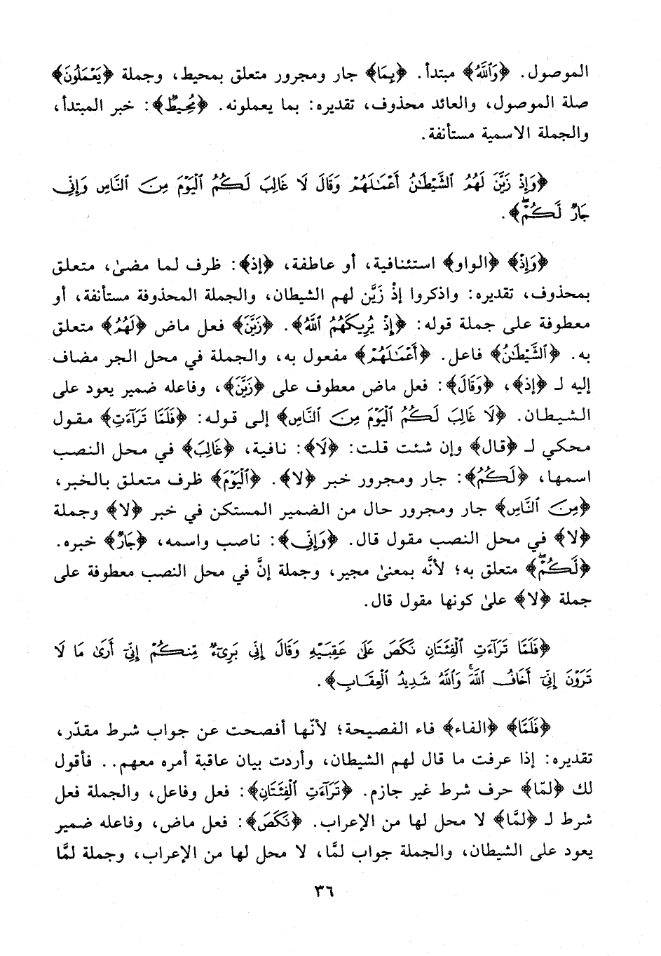 {وَإِذْ} {الواو} استئنافية، أو عاطفة، {وَإِذ}: ظرف لما مضى، متعلق بمحذوف، تقديره: واذكروا إذْ زَيَّن لهم الشيطان، والجملة المحذوفة مستأنفة، أو معطوفة على جملة قوله: {إذْ يُرِيكَهُمُ اللَّهُ} {زَيَّنَ} فعل ماض {لَهُمُ} متعلق به. {الشَّيْطَانُ} فاعل. {أَعْمَالَهُمْ} مفعول به، والجملة في محل الجر مضاف إليه لـ {إذ}، {وَقَالَ}: فعل ماض معطوف على {زَيَّنَ}، وفاعله ضمير يعود على الشيطان. {لَا غَالِبَ لَكُمُ الْيَوْمَ مِنَ النَّاسِ} إلى قوله: {فَلَمَّا تَرَاءَتِ} مقول محكي لـ {قال} وإن شئت قلت: {لَا}: نافية، {غَالِبَ} في محل النصب اسمها، {لَكُمْ}: جار ومجرور خبر {لا}. {الْيَوْمَ} ظرف متعلق بالخبر، {مِنَ النَّاسِ} جار ومجرور حال من الضمير المستكن في خبر {لا} وجملة {لا} في محل النصب مقول قال. {وَإِنِّي}: ناصب واسمه، {جَارٌ} خبره. {لَكُمْ} متعلق به؛ لأنَّه بمعنى مجير، وجملة إنَّ في محل النصب معطوفة على جملة {لا} على كونها مقول قال.